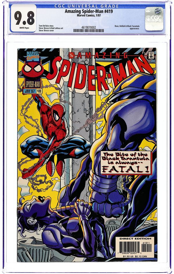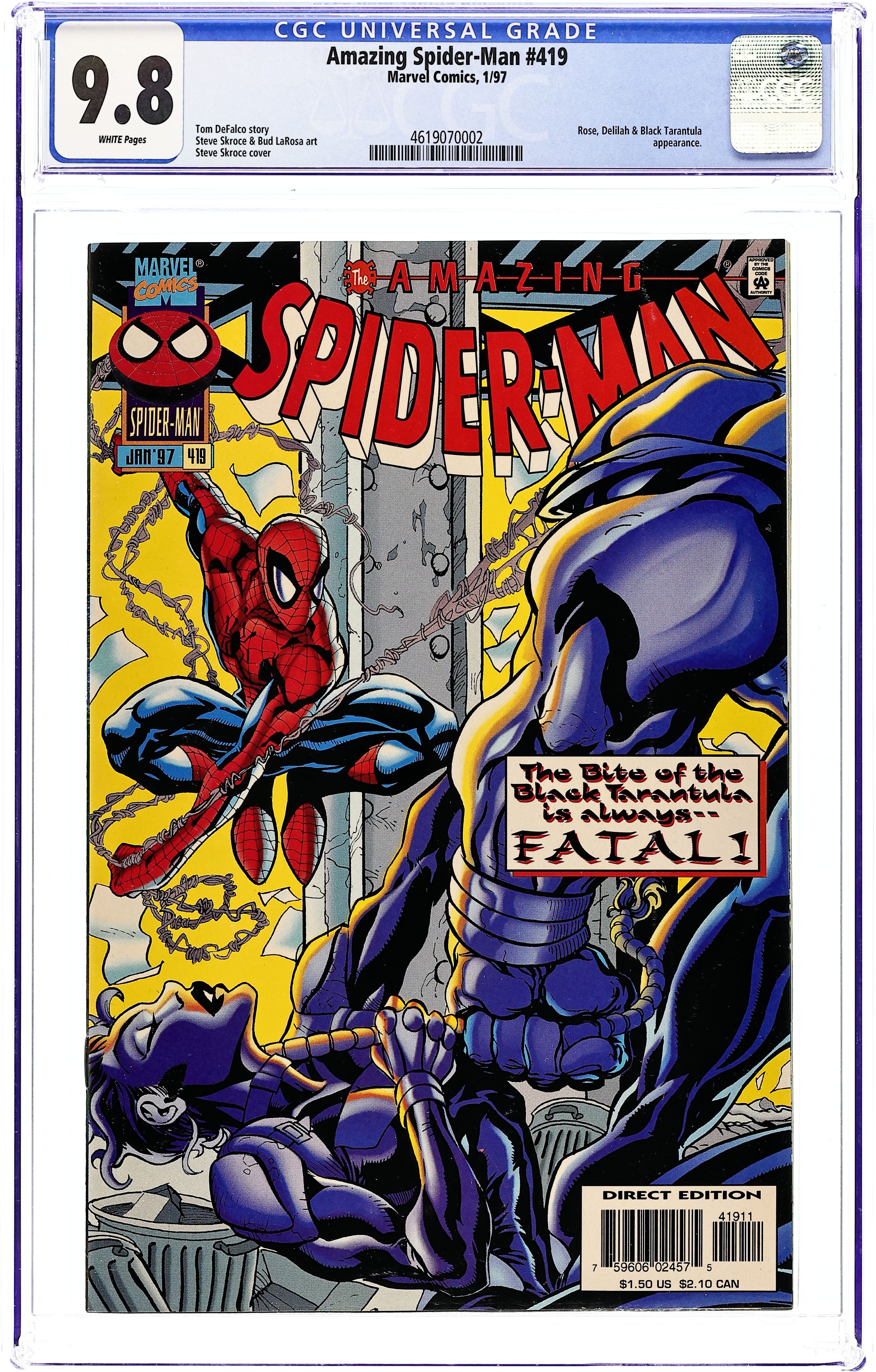 Direct Edition. "Beware the Black Tarantula," script by Tom DeFalco, pencils by Steve Skroce, inks by Bud LaRosa; The Black Tarantula seeks to extend his influence into New York; Ben Urich learns the Tarantula is selling a million dollars in smuggled emeralds to the Rose, who plots to use the sale as a way to double-cross Tarantula; At the Parker house, Mary Jane finally manages to paint over the nursery; Anna Watson, who has moved in with Peter and MJ, inspires her to return to college; Peter contemplates going back too as he heads out to find leads on the Tarantula; Discovering where the buy is taking place, he calls Ben and heads to the Stockbridge Shipping Pier; There, Delilah and the Rose's men confront the incredibly strong El Uno, believed by all to be Tarantula. 36 pgs., full color. $1.50. Cover price $1.50.