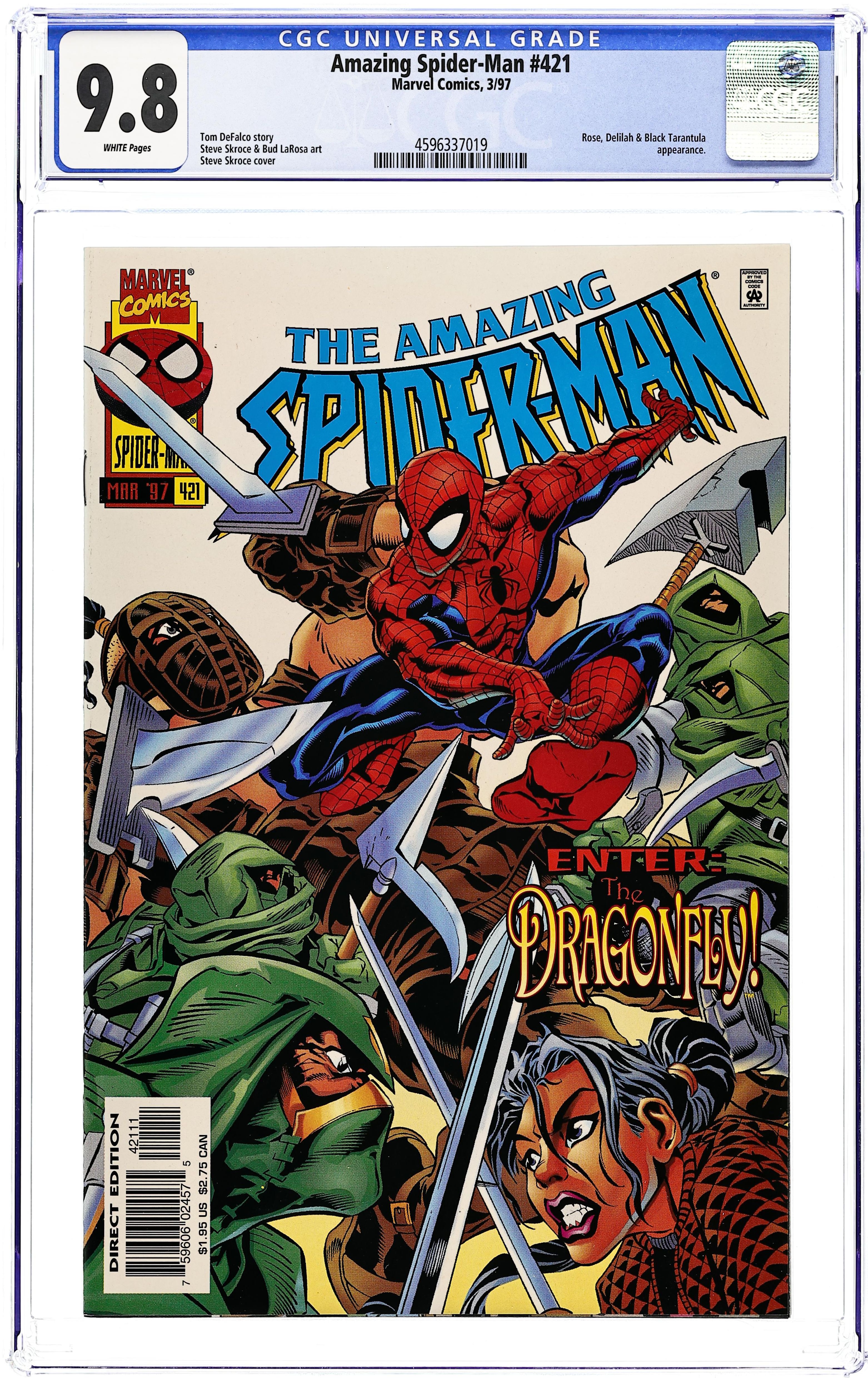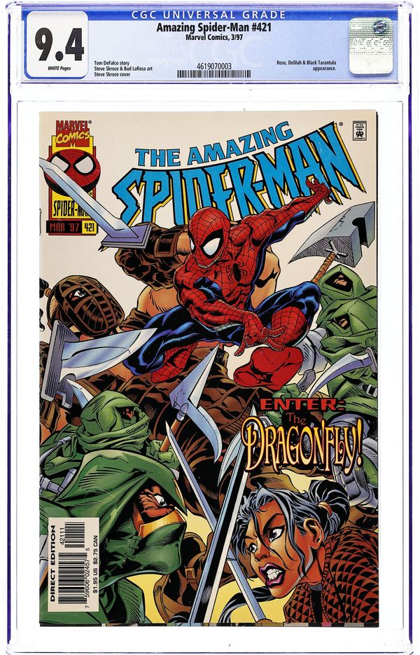 First $1.95 cover price. Cover pencils by Steve Skroce. "And Death Shall Fly Like a Dragon!", script by Tom DeFalco, pencils by Steve Skroce, inks by Bud LaRosa; While on assignment for the Bugle, Peter runs into Angela Yin meeting her cousin Meiko at the Seaport carnival; A group of ninjas, the True Believers, led by Karsano who believes he has the Dragonfly power, attack Meiko, prodding Spider-Man into action; Later, Meiko joins Angela at her apartment where she reveals that the True Believers' honor code allows Karsano three attempts on her life; The Seaport attack was the second. Spidey and the True Believers track Meiko down; Karsano fells Meiko but Spidey breaks his ceremonial sword; Having failed a third time, Karsano declares himself a fraud and commits ritual suicide. "Hidden Agendas!", script by Tom DeFalco, art by Geof Isherwood; Spider-Man vs. The Rose, Delilah, and Black Tarantula. 36 pgs., full color. $1.95. Cover price $1.95.