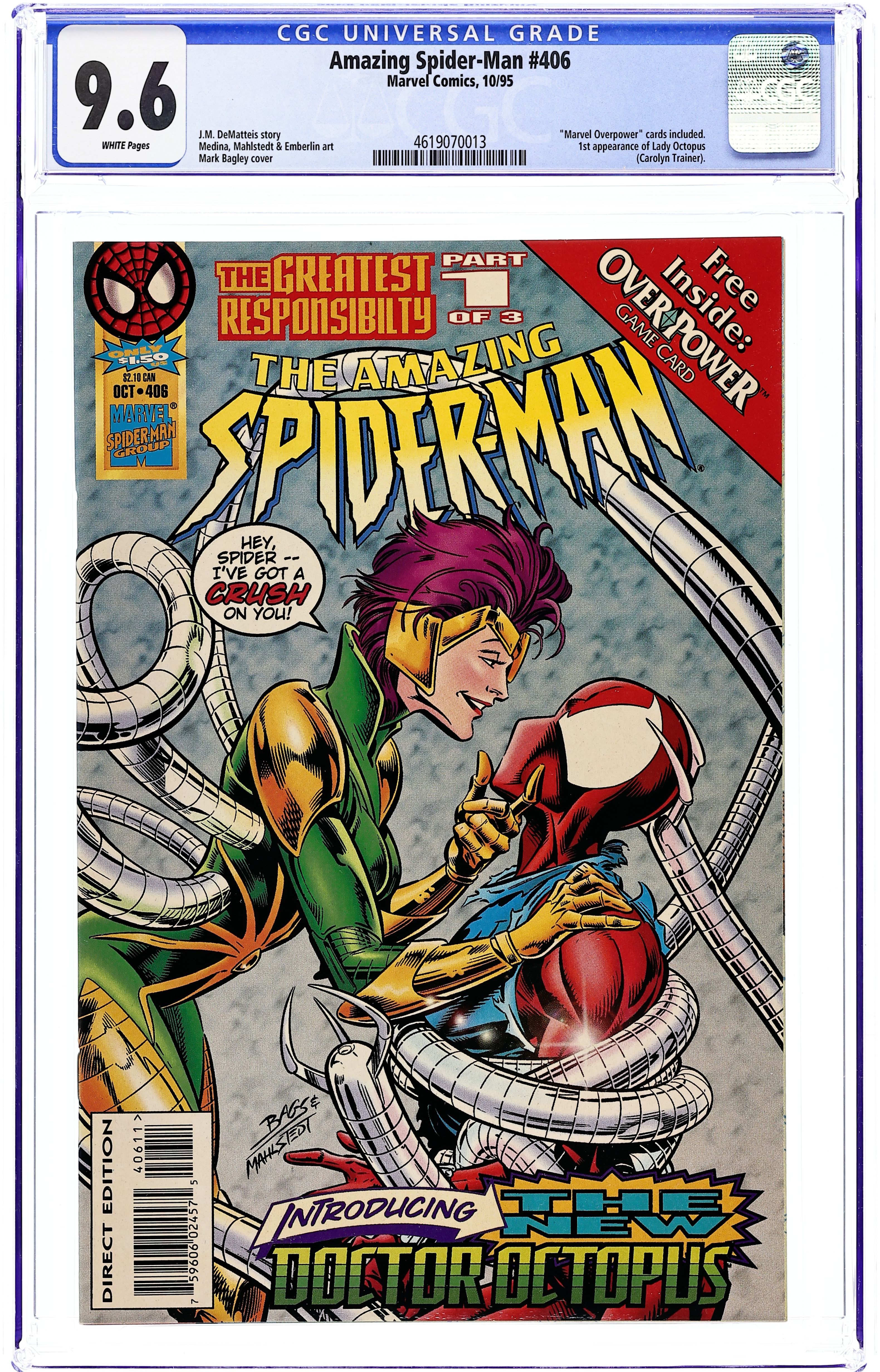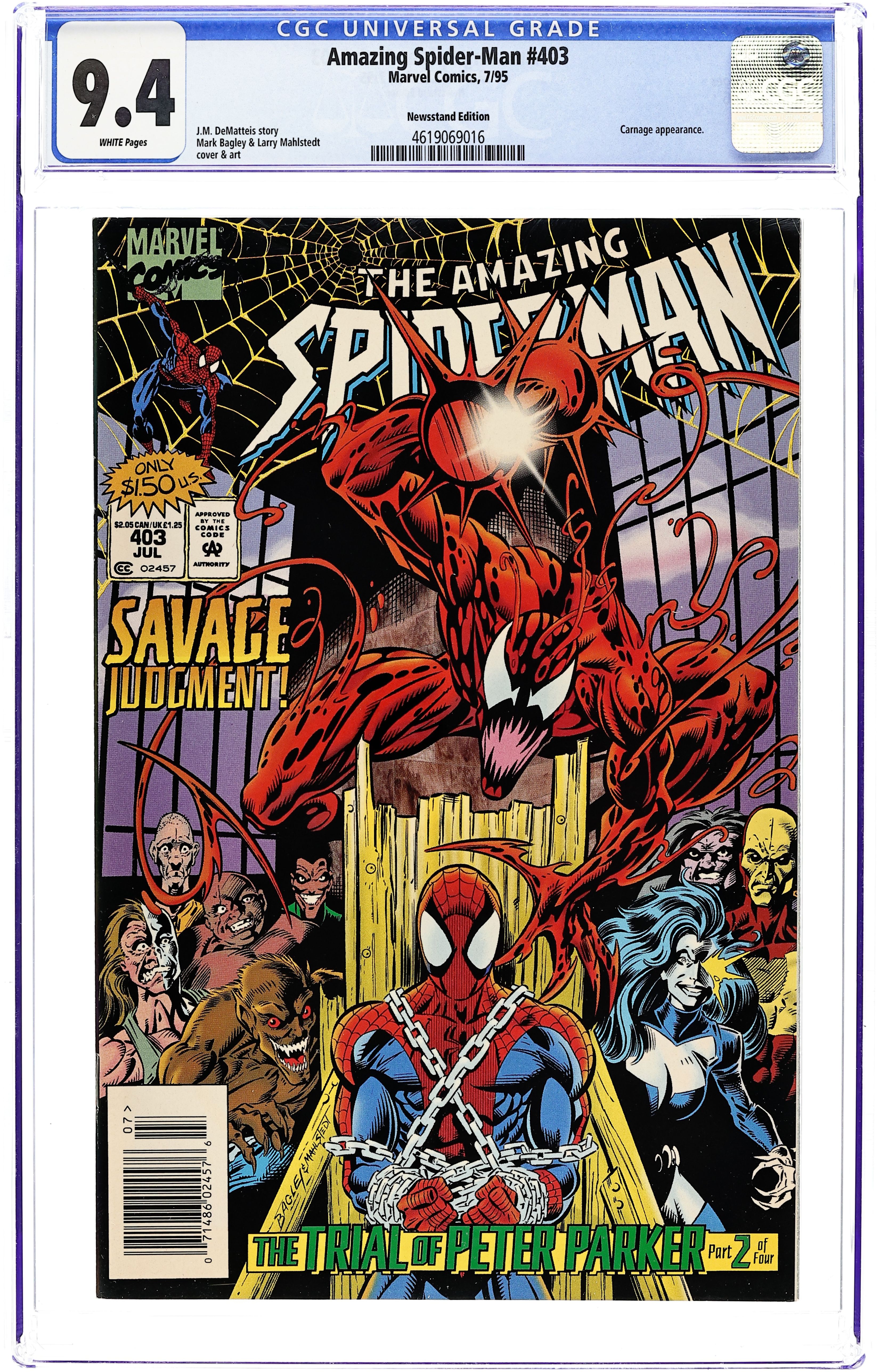 Direct Edition. Cover pencils by Mark Bagley, inks by Larry Mahlstedt. It's Carnage versus Spidey in Web of Carnage Part 2 of 4, "And Now - Spider-Carnage," script by Tom DeFalco, pencils by Mark Bagley, inks by Larry Malhstedt and Randy Emberlin; Spidey and Peter learn the Spider-skeleton is an actual Spider-Man clone and that Ben's girlfriend Jessica Carradine is the Burglar's daughter (SenSM #3, '96); Meanwhile, Carnage terrorizes the city even though Cletus Kasady is safe in his cell; Seeking answers, Spidey follows Ravencroft guard Dickerson to an underground super-villain-worshipping club where Dickerson sells Carnage memorabilia filched from Ravencroft; Carnage attacks the club, and battles Spidey, escaping after bringing down the roof; At the Daily Bugle, Jessica gets a job to photograph Spidey as a public menace; Spidey tails Ravencroft security chief John Jameson, discovering him possessed by the Carnage symbiote. The story continues from Sensational Spider-Man 3 and continues in Spider-Man 67. 36 pgs., full color. $1.50. Cover price $1.50.
