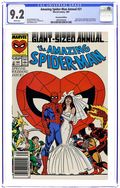 Direct Edition. "Abominations!" Guest-starring She-Hulk. Part 4 of the Atlantis Attacks storyline. Plot by Gerry Conway. Script by David Michelinie. Pencils by Rob Liefeld. Inks by Tim Dzon, James Brock, Vince Mielcarek, and Keith Williams. Cover by John Byrne. Lord Ghaur, Llyra, and Tyrannus descend on Manhattan for the next phase of their diabolical plot to subjugate the Earth! Their plan to create death and destruction is simple: unleash the deranged Abomination on the helpless citizens of New York City! Fortunately though, two super-heroes close by hear the ruckus and answer the call for help! Spider-Man and She-Hulk! Wow, can they stop one of the Hulk's greatest foes? On the east side waterfront, the web-slinger and She-Hulk throw down with determination against the Abomination! Katie bar the door! The Atlantis Attacks storyline continues in Punisher Annual 2. Cameo appearances by Mary Jane Watson, Flash Thompson, Aunt May, Lance Bannon, Clark Kent, J. Jonah Jameson, the Viper, and the Kingpin. First backup story: Re-telling of Spider-Man's origin in "My Science Project." Script by Gerry Conway. Pencils by Mark Bagley. Inks by Mike Esposito. Second backup story: "Standards of Behavior" Script by Gerry Conway. Pencils by Richard Rockwell. Inks by Andy Mushynsky and Don Hudson. Aunt May tangles with sleazy photographer Nick Katzenberg. Third backup story: "Cataclysm" Story by Peter Sanderson. Pencils by Mark Bagley. Inks by Keith Williams. Chapter 4 of the Saga of the Serpent Crown. First backup feature: "Spider-Man's Uncanny Spider-Sense" Script by Tom DeFalco. Pencils by Ron Frenz. Inks by Chris Ivy. 3-page illustration of how the web-slinger's spider-sense works. Second backup feature: "Spider-Man's Top 30 Villain Countdown! Script and art by Fred Hembeck. Third backup feature: "Spider-Man versus J.J.J.! Script and art by Fred Hembeck. 3-page illustration of the long-running feud between the wall-crawler and J. Jonah Jameson. 68 pages. Cover price $2.00.