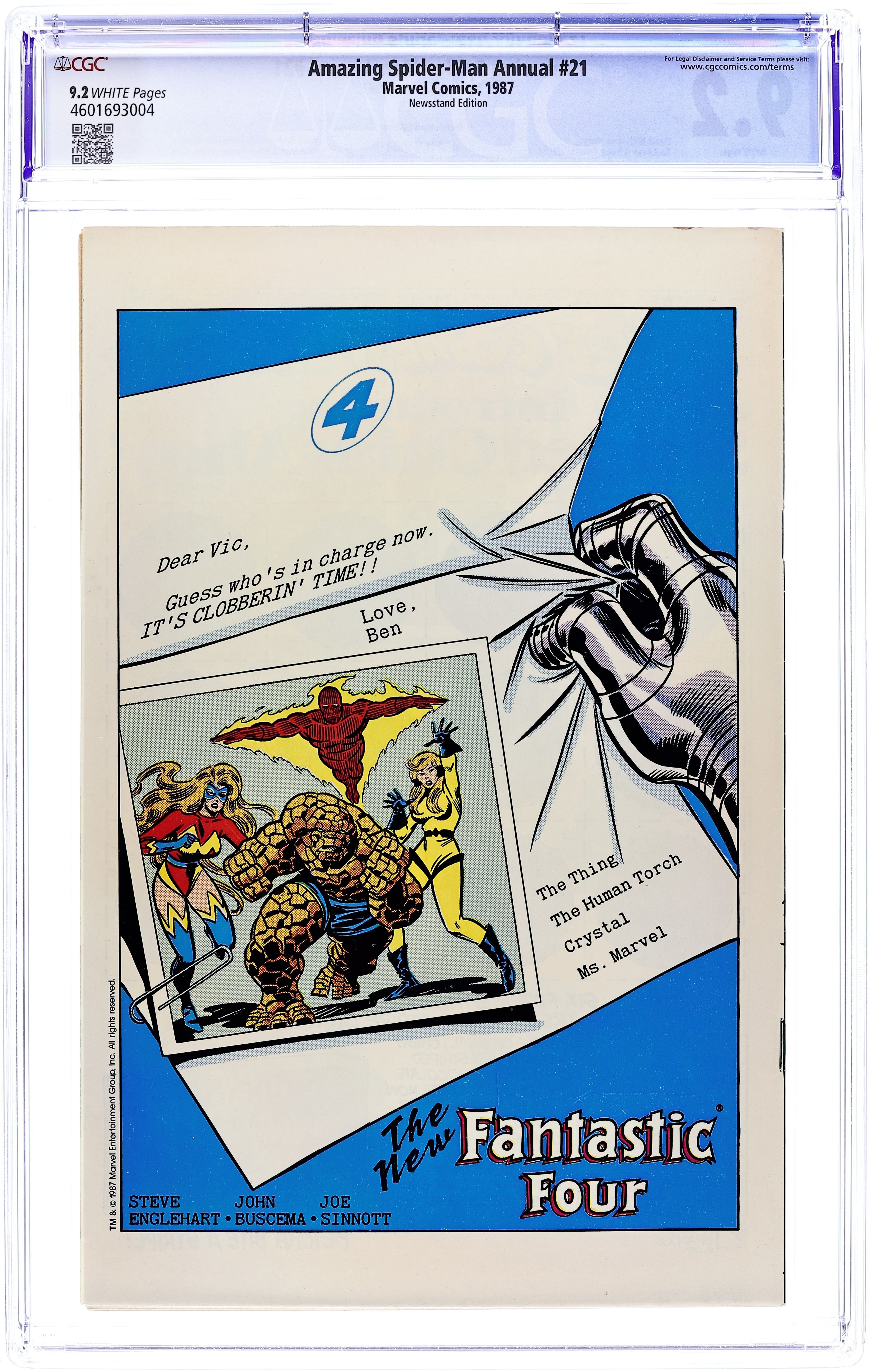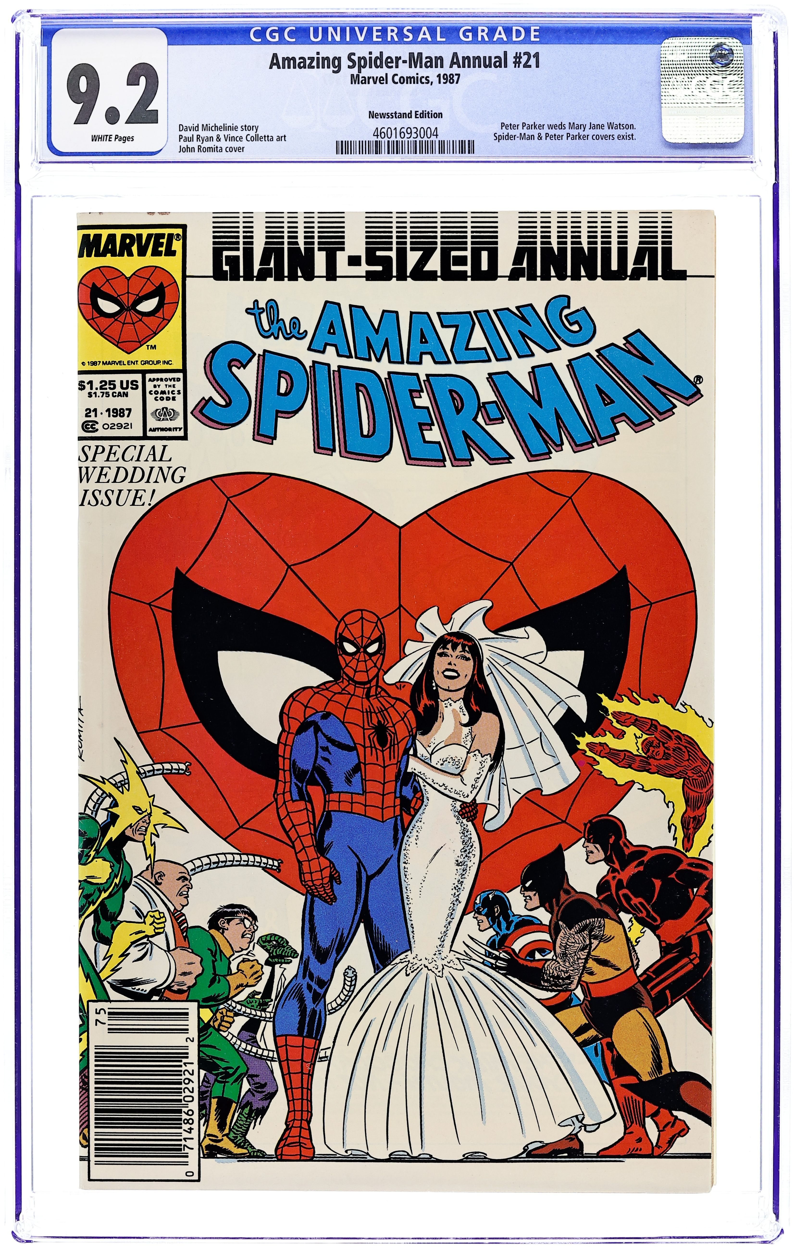 Newsstand Edition. The marriage of Peter Parker and Mary Jane Watson in "The Wedding." Plot by Jim Shooter. Script by David Michelinie. Pencils by Paul Ryan. Inks by Vince Colletta. Cover by John Romita Sr. Newsstand Edition. At long last wedding bells ring for Peter Parker and Mary Jane Watson! What an exciting day! The blushing bride will need something old, something new, something borrowed, and something blue! While the Amazing Spider-Man will need to take care of two things before the big day! First, the easy task...short circuit Electro's latest scheme! And second, the tough one...put the memory and heartache of Gwen Stacy in the past forever. Will another trip to the Brooklyn Bridge bring peace to the wondrous wall-crawler? Or will the ghosts of days gone by derail a bright future with Mary Jane? Carpe diem, web-slinger! Appearances by Flash Thompson, Harry Osborn, Liz Osborn, Betty Leeds, Aunt May, Anna Watson, Joe Robertson, J. Jonah Jameson, and Willi Smith. Flashback cameos by the Green Goblin, Gwen Stacy, and Uncle Ben. (Notes: Peter and Mary Jane go on their honeymoon in Spectacular Spider-Man Annual 7. The Direct Edition cover features Peter Parker's friends and family. The Newsstand Edition depicts Spider-Man's friends and foes. Amazing Spider-Man Annual 21 was one of the first issues Marvel published with two different covers. This story was reprinted in the 1991 trade paperback: the Amazing Spider-Man - The Wedding.) 52 pages. Cover price $1.25.