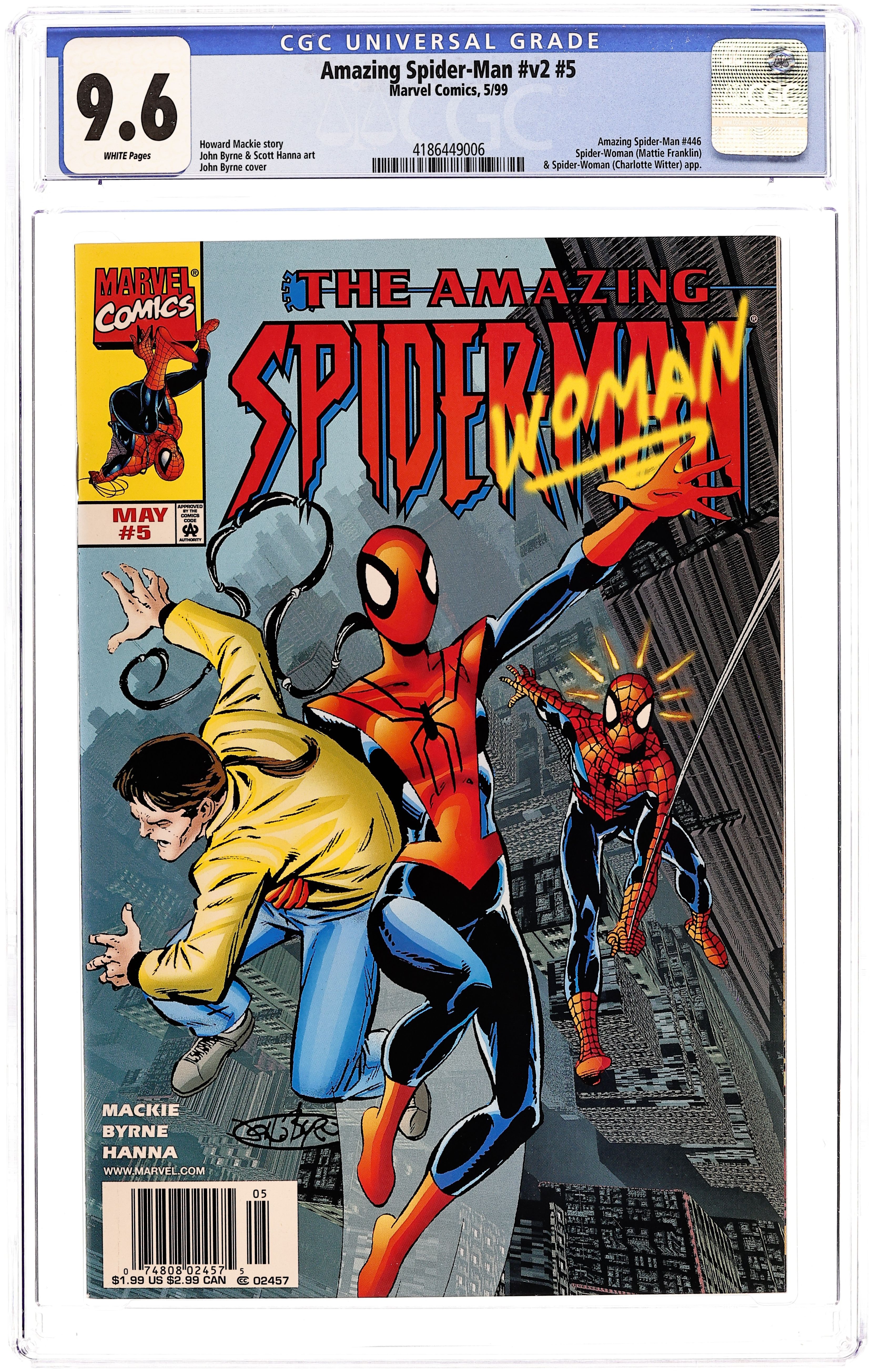 Newsstand Edition. Cover by John Byrne. First appearance of new Spider-Woman in "And Then There Was One!", script by Howard Mackie, pencils by John Byrne, inks by Scott Hanna; Mattie Franklin has given herself a new identity of Spider-Woman; In the opening pages she stops a gang who are robbing a bank of Gold; The Media is very interested and she poses for cameras as she answers question; Meanwhile another much more sinister Spider-Woman is stealing the powers of former Spider-Women; The story switches to Jessica Drew in Madripoor where she uses her powers to fight this new mysterious villain but is quickly defeated; Back in New York Mary Jane is ready to go on a fashion shoot when she almost finds out Peter is hiding his Spider-Man costume in her carry-on bag; Julia Carpenter has fallen victim to the new mysterious Spider-Woman two days earlier; At the Daily Bugle, Jameson is hassling an intern to get the paper out on the streets with the headline "Who is the New Spider-Woman?" 38 pgs., full color. $1.99. Cover price $1.99.