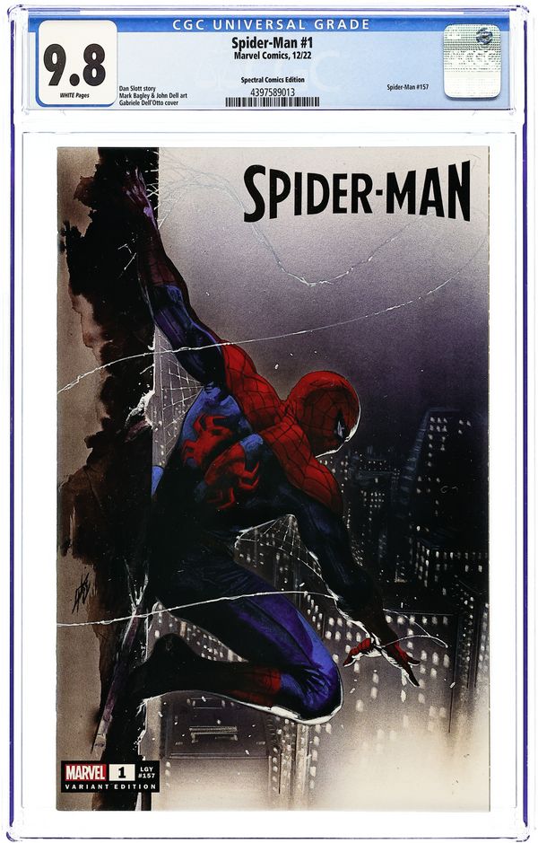 Comics Illuminati (616 Comics, AntiHero Gallery, Unknown Comics, Comic Traders, and Street Level Hero) exclusive Virgin Cover by R1C0. Written by Dan Slott. Art by Mark Bagley. "The End of the Spider-Verse" is here! Morlun is back and he is not alone. Allied with one of the most powerful beings known to the Spider-Verse, the scariest Spider-Villain of all time is making his biggest play and no Spider is safe. Especially not the Chosen Spider himself, Peter Parker. With Peter working for Norman Osborn and using a glider…does he have it coming? Spidey's 60th Anniversary is no joke as two of the most legendary Spider-Creators are working together on Spidey for the first time and you know it's going to be one for the record books! 40 pages, full color. Rated T
