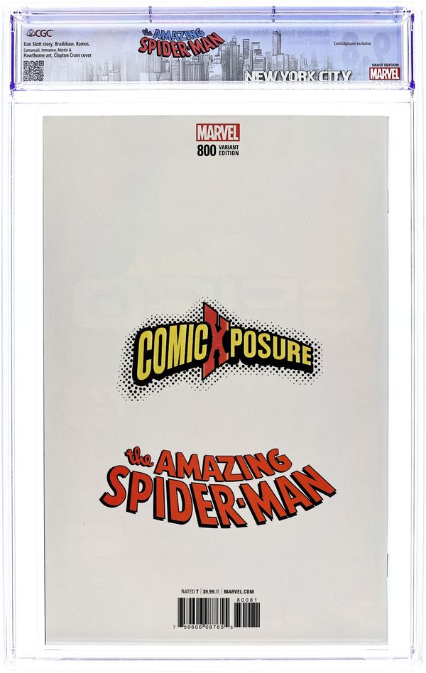 ComicXposure exclusive variant by Clayton Crain. Go Down Swinging: Part 4 of 4 - Written by Dan Slott. Art by Nick Bradshaw, Humberto Ramos, Guiseppe Camuconli, Stuart Immonen, Marcos Martin, Victor Olazaba, Cam Smith and Wade Von Grawbadger. Dan Slott and Stuart Immomen are joined by many of the artists who made the last 10 years of Spider-Man so Amazing! The biggest Peter Parker/Norman Osborn story of all time unfolds over one 80-page story, a scope unmatched in comics! Who lives?! Who dies?! And what scars will Spider-Man bear from here on out?! 92 pages,full color. Rated T