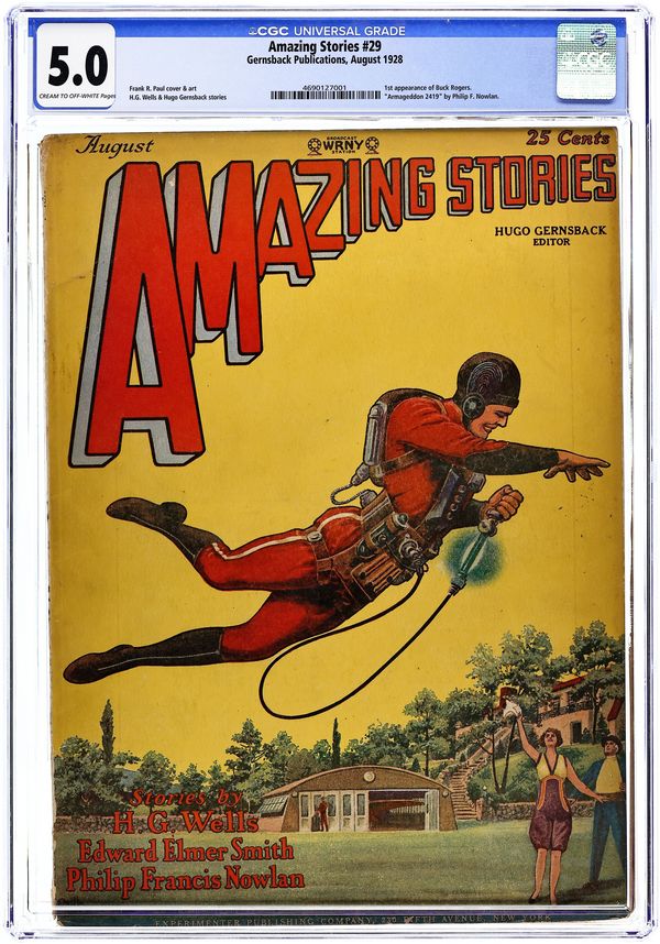 August 1928. Cover art by Frank R. Paul, from "The Skylark of Space" by Edward Elmer "Doc" Smith (his 1st published work). Stories include H. G. Wells, "The Moth"; Philip Francis Nowlan, "Armageddon 2419" which contains the first appearance in any format of Buck Rogers; and more. Edited by Hugo Gernsback. 8" x 11"; black and white with color cover. Cover price $0.25.