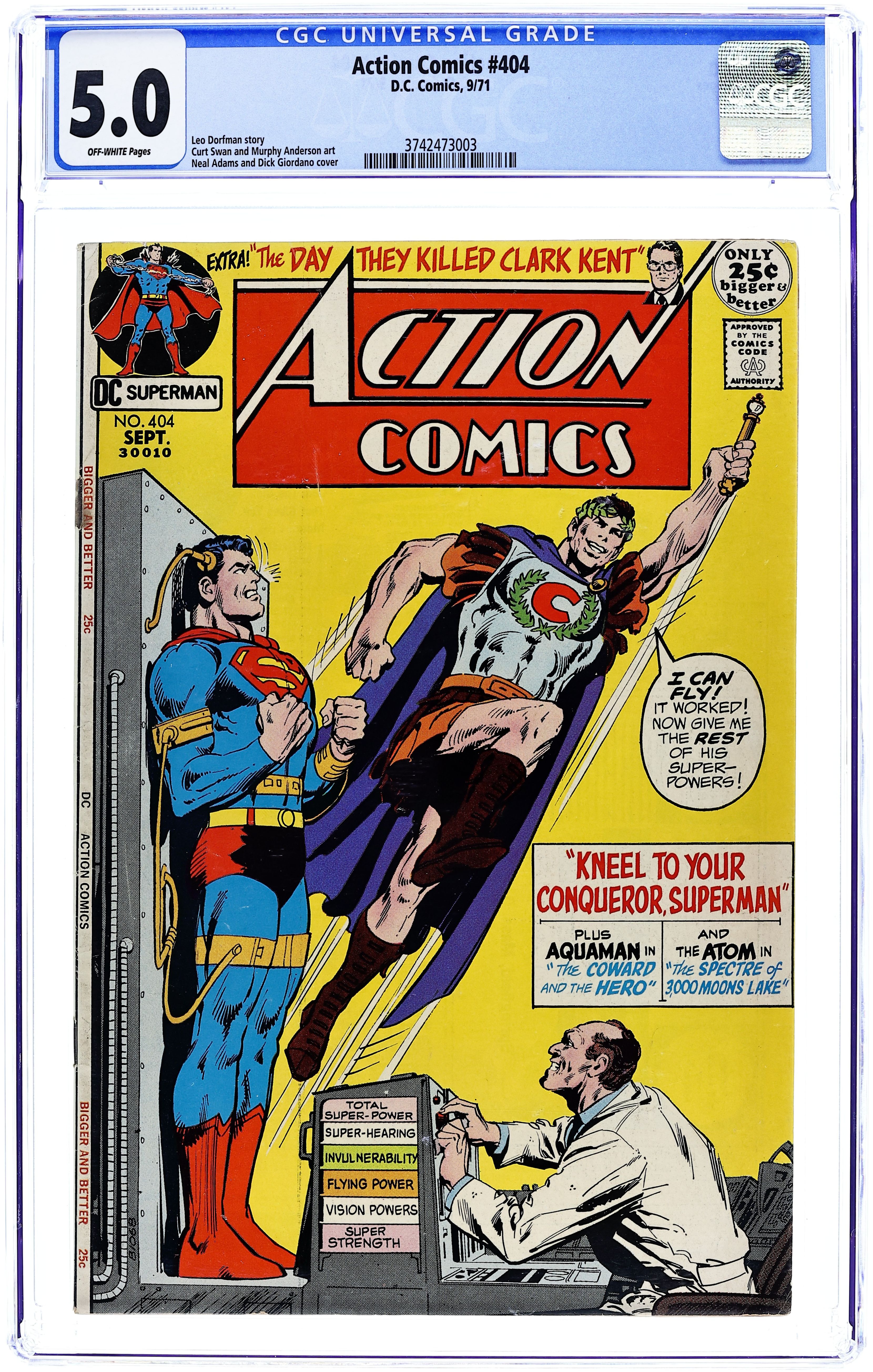 52-page giant. Cover pencils by Neal Adams, inks by Dick Giordano. "Kneel to Your Conqueror, Superman!", script by Leo Dorfman, pencils by Curt Swan, inks by Murphy Anderson; Genius Caesar tries to siphon Superman's powers into his body so he can become a superhero. Classic Atom reprint, "The Specter of 3000-Moons Lake!", script by Gardner Fox, pencils by Gil Kane, inks by Murphy Anderson; The Atom must find out who is pretending to be the ghost of 3000 Moons Lake. Classic Aquaman reprint, "The Coward and the Hero," script by Jack Miller, art by Ramona Fradon; Johnny Blake is tormented by others over his fear of water, but Aquaman helps him overcome his fear. "The Day They Killed Clark Kent," script by Leo Dorfman, pencils by Curt Swan, inks by Murphy Anderson; A college fraternity tries to haze Clark Kent. 52 Pages, Full Color. $0.25 Cover price $0.25.