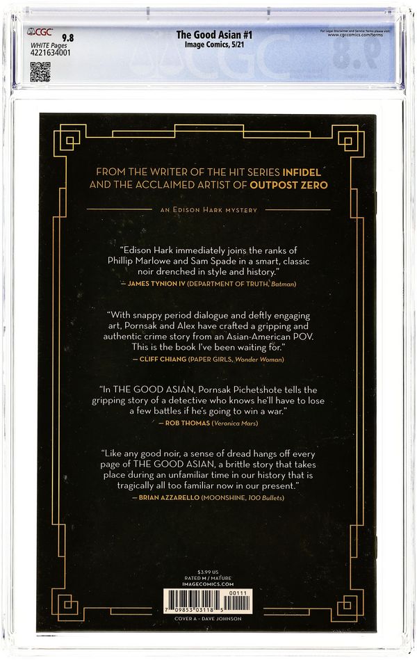 Written by Pornsak Pichetshote. Art by Alexandre Tefenkgi. Cover by Dave Johnson. Writer PORNSAK PICHETSHOTE's long-awaited follow-up to the critically acclaimed INFIDEL with stunning art by ALEXANDRE TEFENKGI (OUTPOST ZERO)! Following Edison Hark-a haunted, self-loathing Chinese-American detective-on the trail of a killer in 1936 Chinatown, THE GOOD ASIAN is Chinatown noir starring the first generation of Americans to come of age under an immigration ban, the Chinese, as they're besieged by rampant murders, abusive police, and a world that seemingly never changes. 'With snappy period dialogue and deftly engaging art, PORNSAK and ALEX have crafted a gripping and authentic crime story from an Asian-American POV. 36 pages, full color. Rated M Cover price $3.99.