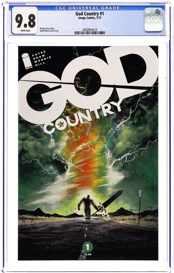 Image Blind Box Variant. Written by Donny Cates. Art by Geoff Shaw and Jason Wordie. Cover by Geoff Shaw. SERIES PREMIERE Emmet Quinlan, an old widower rattled by dementia, isn't just a problem for his children-his violent outbursts are more than the local cops can handle. When a tornado levels his home-as well as the surrounding West Texas town-a restored Quinlan rises from the wreckage. The enchanted sword at the eye of the storm gives him more than a sound mind and body, however. He's now the only man who can face the otherworldly creatures the sword has drawn down to the Lone Star State... 28 pages, full color. Rated M