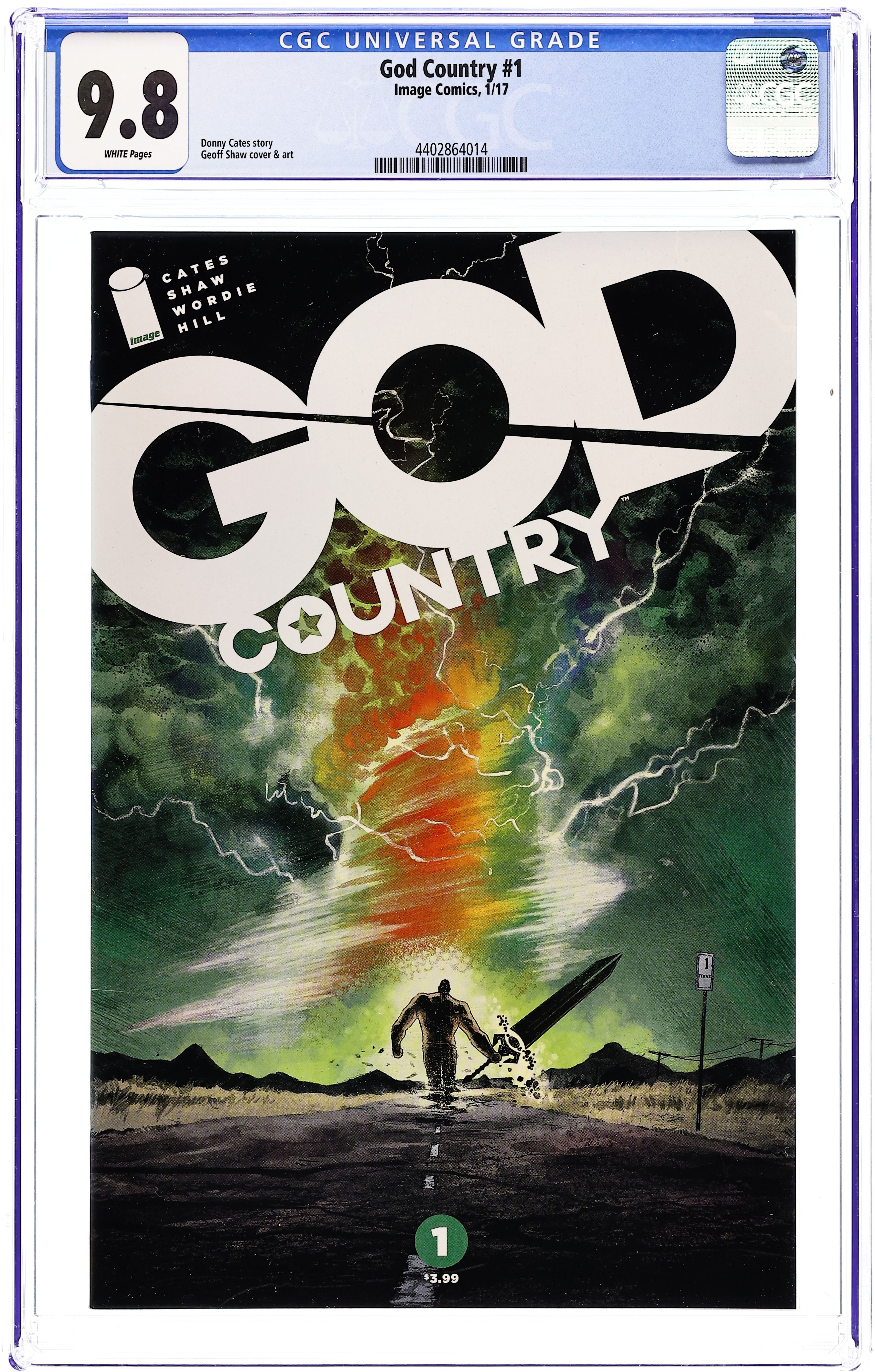 4th Printing. Written by Donny Cates. Art by Geoff Shaw and Jason Wordie. Cover by Geoff Shaw and Dave Stewart. SERIES PREMIERE Emmet Quinlan, an old widower rattled by dementia, isn't just a problem for his children-his violent outbursts are more than the local cops can handle. When a tornado levels his home-as well as the surrounding West Texas town-a restored Quinlan rises from the wreckage. The enchanted sword at the eye of the storm gives him more than a sound mind and body, however. He's now the only man who can face the otherworldly creatures the sword has drawn down to the Lone Star State... 28 pages, full color. Rated M Cover price $3.99.