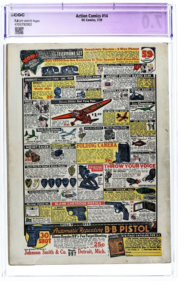 Cover art by Jack Burnley and Stan Kaye. Superman Takes a Holiday, script by Don Cameron (signed as Jerry Siegel), pencils by Sam Citron (signed as Joe Shuster). A Challenge from the Pyramids starring Vigilante, art by Mort Meskin (signed as Mort Morton Jr.). The Forest Primeval starring Congo Bill, art by John Daly. Words are Weapons starring Americommando, script by Joseph Greene, art by Bernard Baily. Clouds of Crime starring Zatara. 60 Pages, Full Color. $.10 Cover price $0.10.
