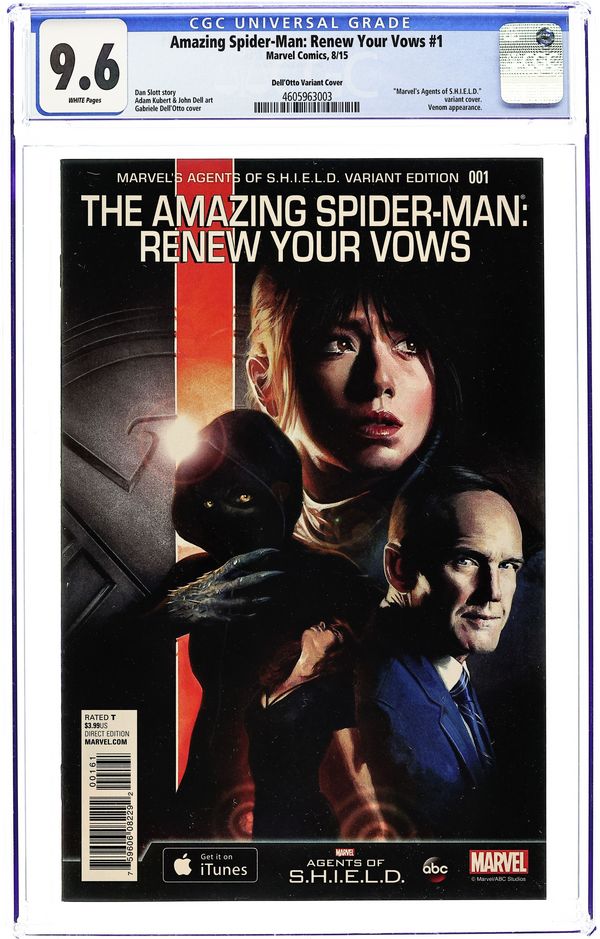 Limited 1 for 15 Retailer Incentive Variant Cover. Written by Dan Slott. Art by Adam Kubert. Cover by Gabriele Dell'Otto. THE LAST SPIDER-MAN STORY Not even The Amazing Spider-Man is safe from Secret Wars! In this new Marvel Universe, Peter Parker, Mary Jane Watson and their daughter have to scrape by to make ends meet, but they have each other… Face front, True Believers. This is the one you've been asking for. Rated T Cover price $3.99.