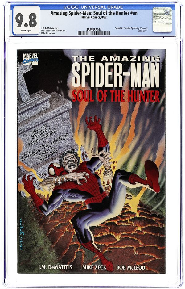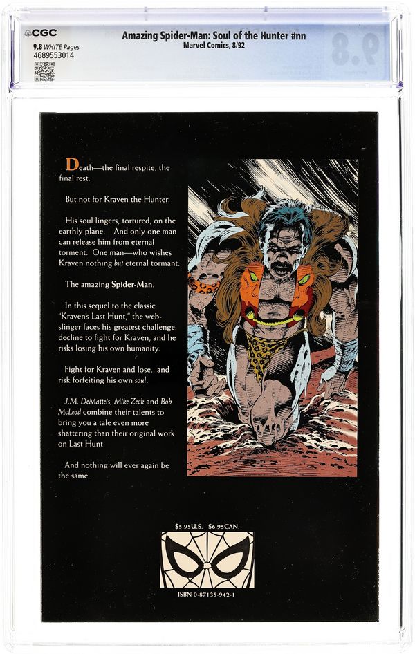 Soul of the Hunter - Written by J.M. DeMatteis. Art by Mike Zeck and Bob McLeod. Cover by Mike Zeck and Phil Zimelman. Death -- the final respite, the final rest. But not for Kraven the Hunter. His soul lingers, tortured, on the earthly plane. And only one man can release him from eternal torment. One man -- who wishes Kraven nothing but eternal torment. The amazing Spider-Man. In this sequel to the classic "Kraven's Last Hunt," the webslinger faces his greatest challenge: decline to fight for Kraven, and he risks losing his own humanity. Fight for Kraven and lose...and risk forfeiting his own soul. J.M. DeMatteis, Mike Zeck and Bob McLeod combine their talents to bring you a tale even more shattering than their original work on Last Hunt. And nothing will ever again be the same. 48 pages, full color. Cover price $5.95.