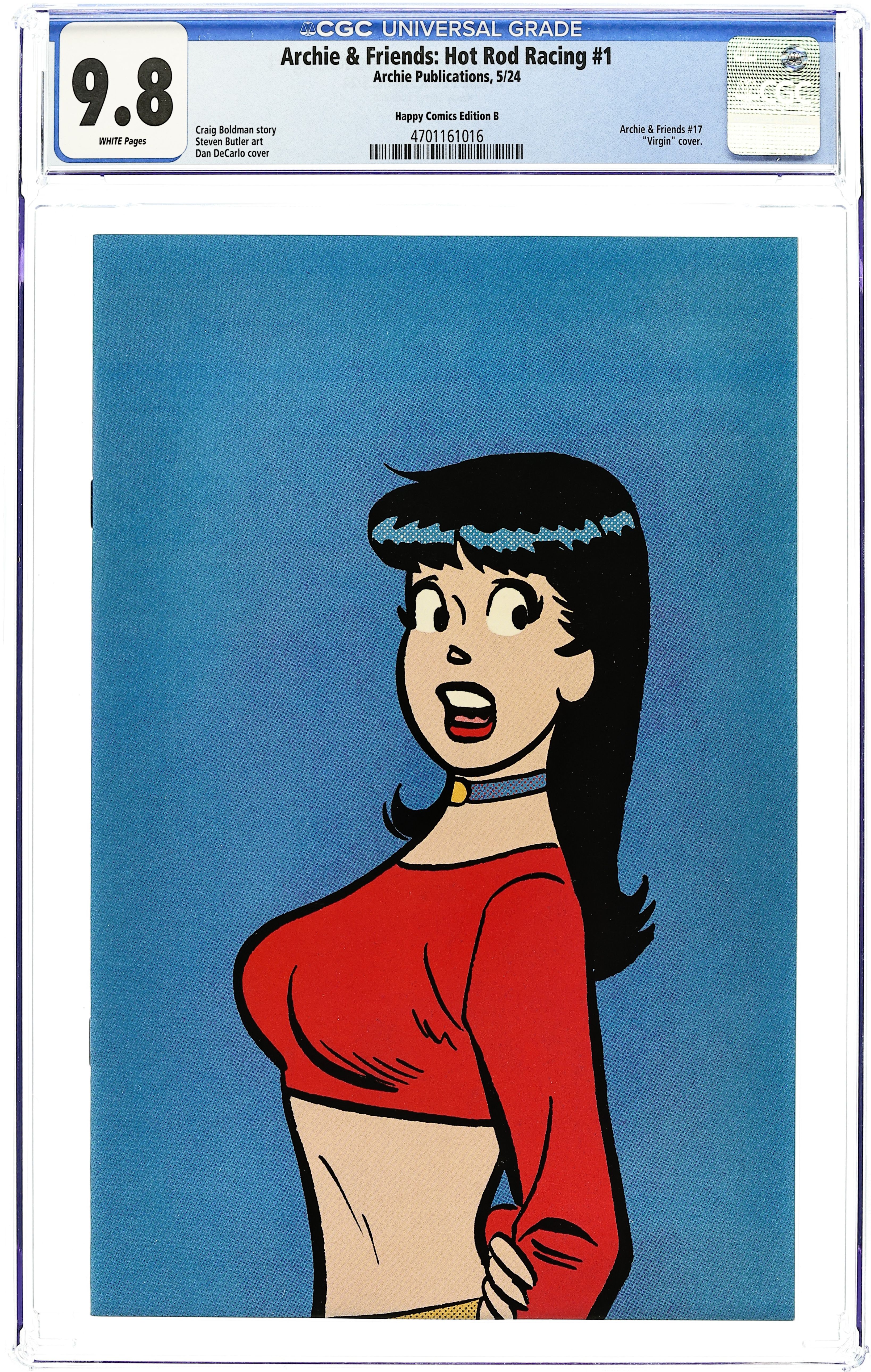 Happy Comics "Veronica" Edition Virgin Cover by Dan DeCarlo - limited to 250 copies. Written by Craig Boldman and Various. Art by Stephen Butler and VARIOUS. A BRAND-NEW STORY kicks off this NEED FOR SPEED issue! In 'The Race to Save Face,' First Appearance of Daisy Thunder, of the Southside Serpents, challenges Archie and his crew to a charity race throughout the Riverdale. Can Archie prove that his souped up jalopy can best Daisy's hot wheels? All that plus more racing fun! 32 pages, full color.