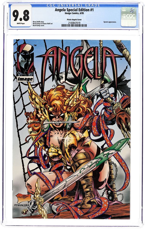 Newsstand Edition. Cover art by Greg Capullo. Untitled Angela story, script by Neil Gaiman, art by Greg Capullo; Angela is charged with Treason for failing to kill Spawn. Angela pinup, art by Sean Parsons and Brad Gorby. 36 pgs. $2.25. Cover price $2.25.