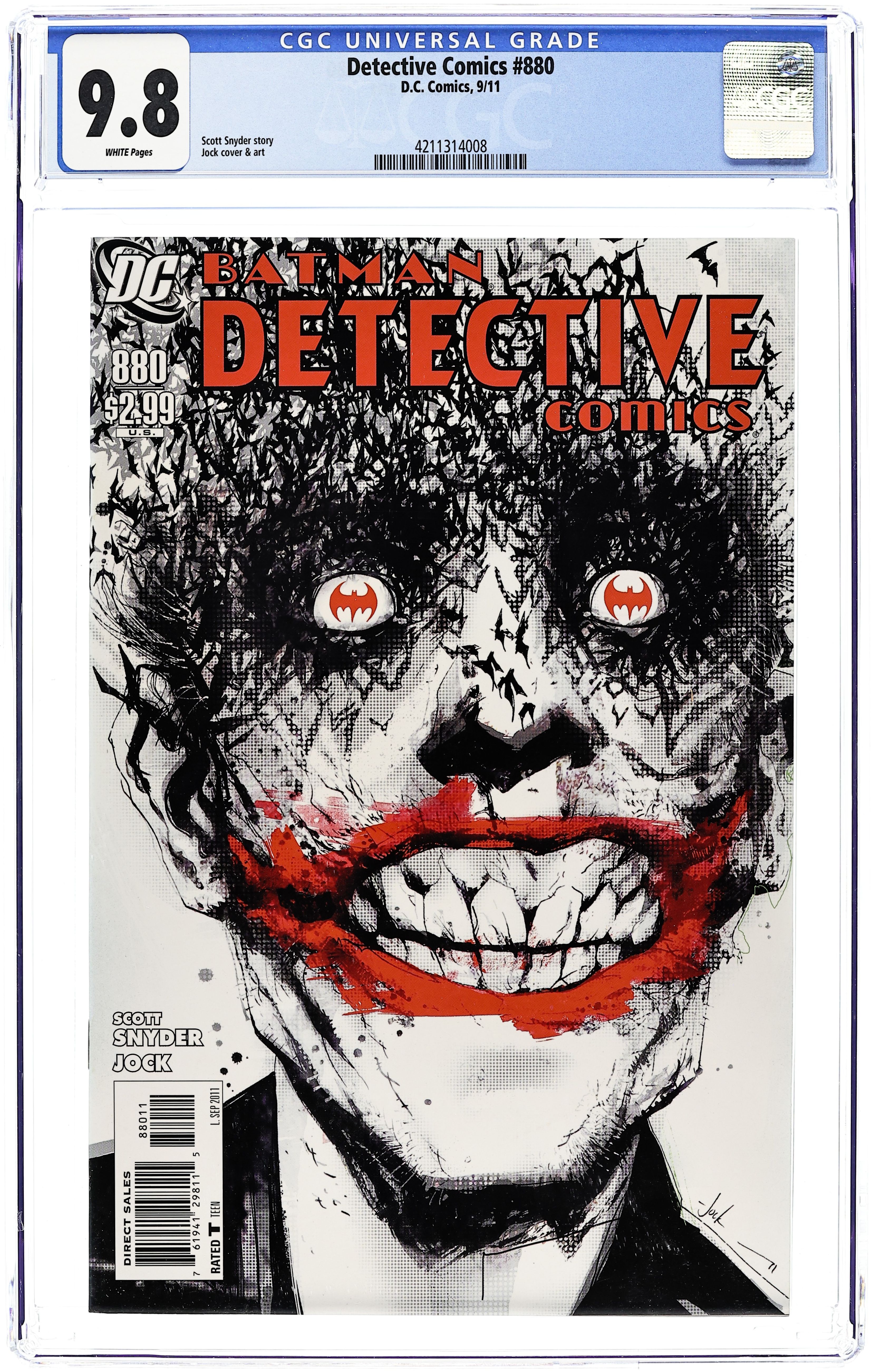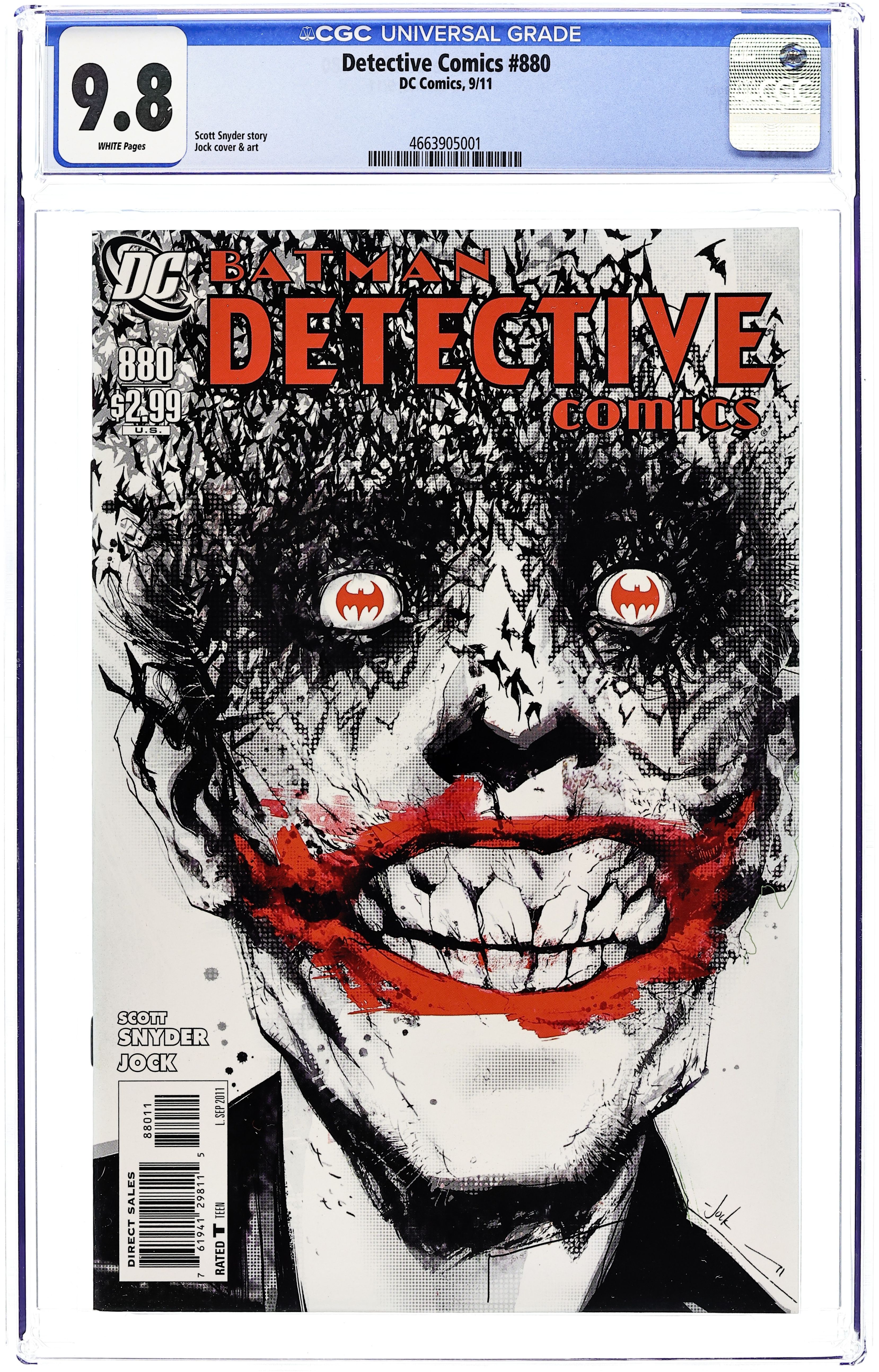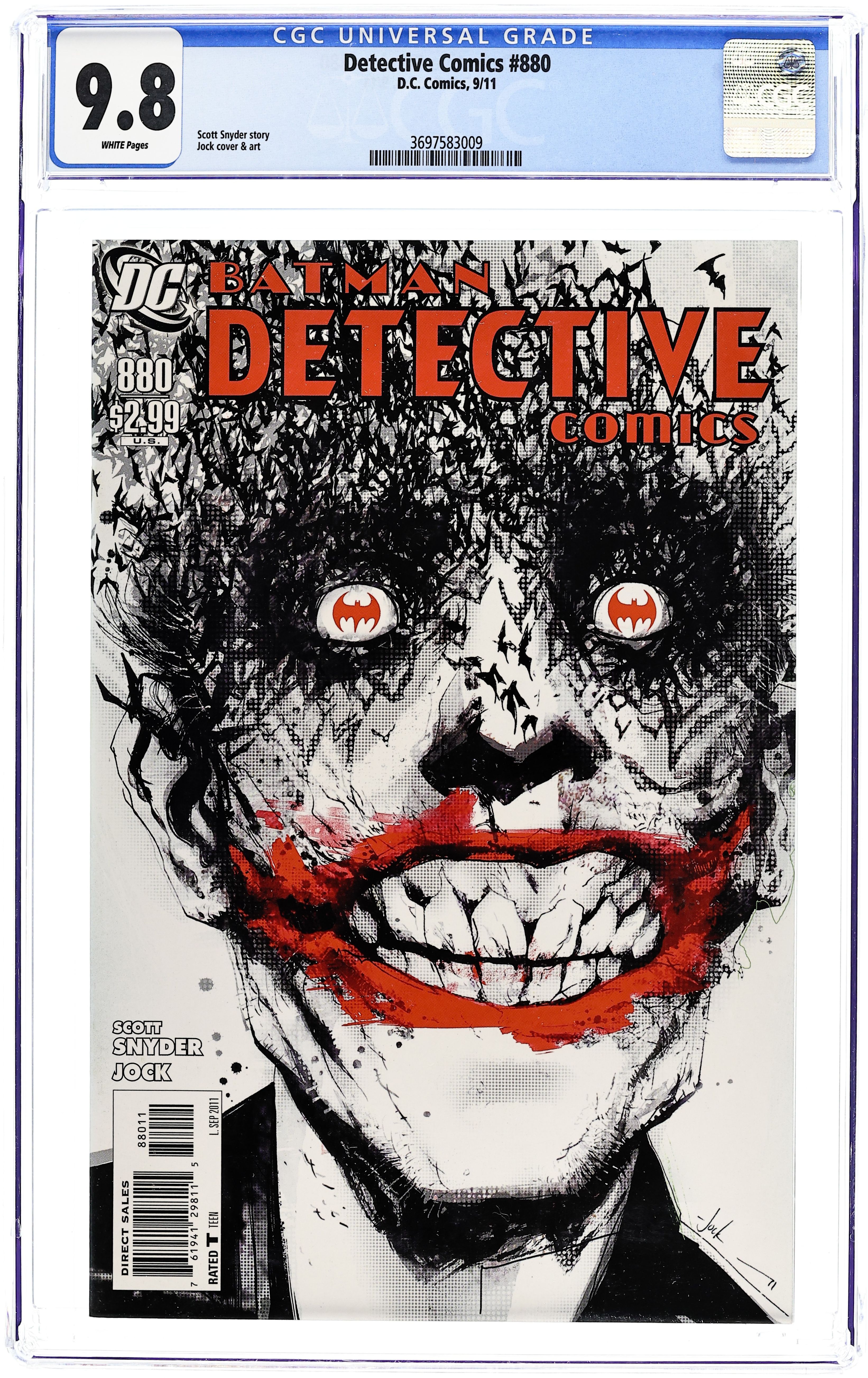 Direct Edition. Written by SCOTT SNYDER. Art and cover by JOCK. It all comes down to this! The Joker is on the loose in the catacombs beneath Gotham City, more vicious and frightening than ever. But even as Batman closes in on The Clown Prince of Crime, he begins to suspect that the city may be the target of an even deadlier threat - one that could shake Gotham City to its core. 36 pgs. FC, RATED T Cover price $2.99.