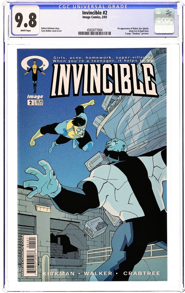 (W) Robert Kirkman (A) Cory Walker (Cover) Cory Walker & Bill Crabtree. FC 32pp $2.95 Ongoing monthly series In stores the week of July 9th THE CONCEPT: Mark Grayson is just like most everyone else his age. He's a senior at a normal American high School. He has a crappy part time job after school and on weekends. He likes girls quite a bit... but doesn't quite understand them. He enjoys hanging out with his friends, and sleeping late on Saturdays... at least until the good cartoons come on. The only difference between Mark and everyone else is that his father is the most powerful superhero on the planet, and as of late, he seems to be inheriting his father's powers. Which sounds okay at first, but how do you follow in your father's footsteps when you know you will never live up to his standards? THIS ISSUE: Mark and his good buddy, William go on a trip to Upstate University to see if they want to attend college there next year. All seems to be going well, they spend the day touring dorms, meeting faculty and checking out all the hot college chicks. The only problem is something has gone wrong at Upstate... something terribly wrong. Luckily for them the world's coolest new superhero, Invincible, is on hand to save their bacon. This stand-alone story is a perfect jumping on point for new readers, a great opportunity to find out what all the buzz is about! Cover price $2.95.