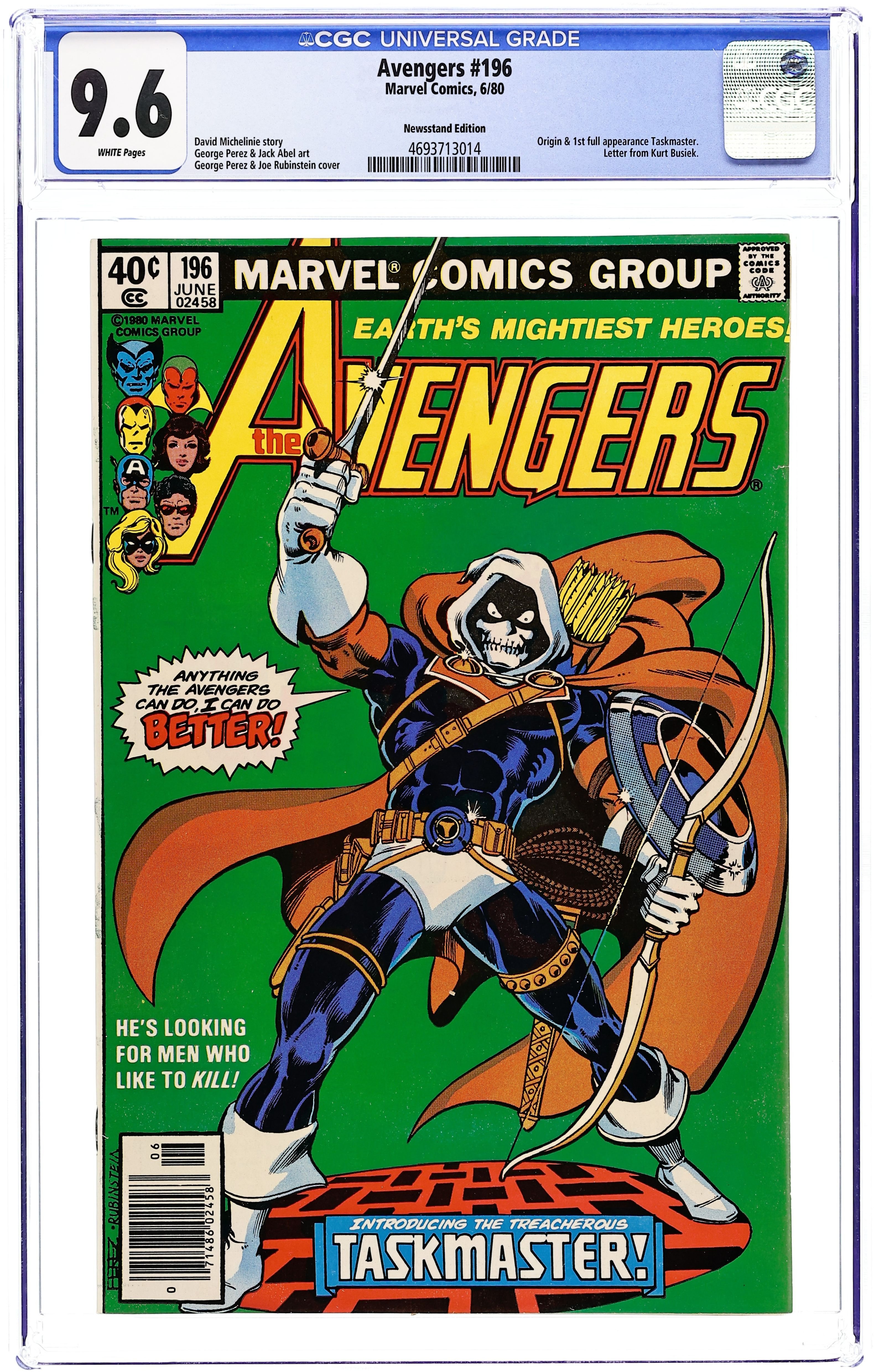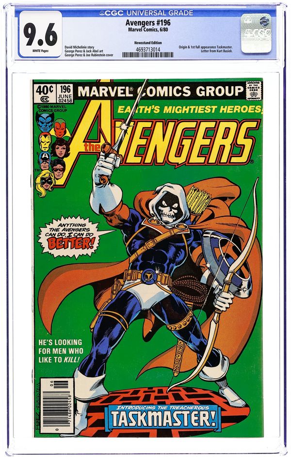Newsstand Edition. "The Terrible Toll of the Taskmaster" Guest-starring Ant-Man. Script by David Michelinie. Pencils by George Perez. Inks by Jack Abel. Cover by George Perez and Joe Rubinstein. A brand new villain, the Taskmaster, has turned the tables on the Wasp, Yellowjacket, and Ant-Man! The three insect-like super-heroes are prisoners inside the Taskmaster's training academy! The good news is that seven avengers are waiting outside the training compound, but the bad news...none of them know that their teammates are in grave danger! However, Earth Mightiest Heroes follow the ants, and the trail leads to the Taskmaster! Is the villain with the photographic reflexes ready to battle the Avengers? Choose wisely dear Taskmaster! First (full) appearance and origin of the Taskmaster. (Notes: The Taskmaster appears next in Marvel Team-Up 103. The letters page includes a letter from comics writer Kurt Busiek.) 36 pages Cover price $0.40.