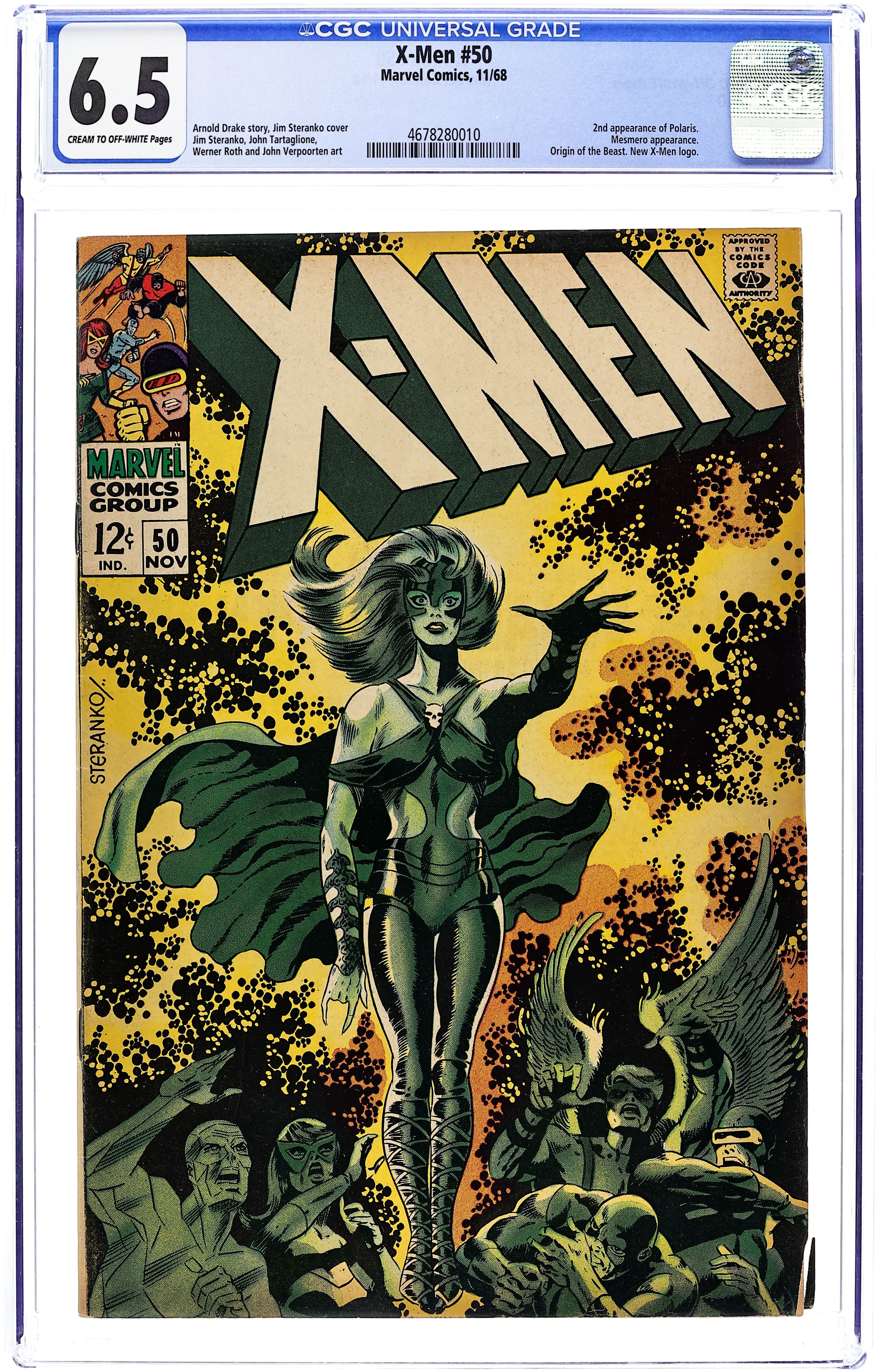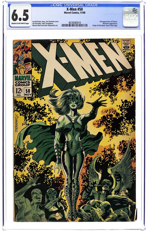 First appearance of Lorna Dane (Polaris). Cover art by Jim Steranko. Who Dares Defy the Demi-Men?, script by Arnold Drake, pencils by Don Heck and Werner Roth, inks by John Tartaglione; Angel warns Jean about Cerebro beeping loudly, and she tells the other X-Men; a group commanded by Mesmero uses a machine (along with his powers) to turn latent mutants into full-fledged mutants in order to form his army; 1st appearance of Mesmero. A Beast Is Born--The Origins of the Uncanny X-Men, script by Arnold Drake, art by Werner Roth; how Beast got his powers. Letter to the editor from comic writer Tony Isabella. 36 pgs. $0.12. Cover price $0.12.
