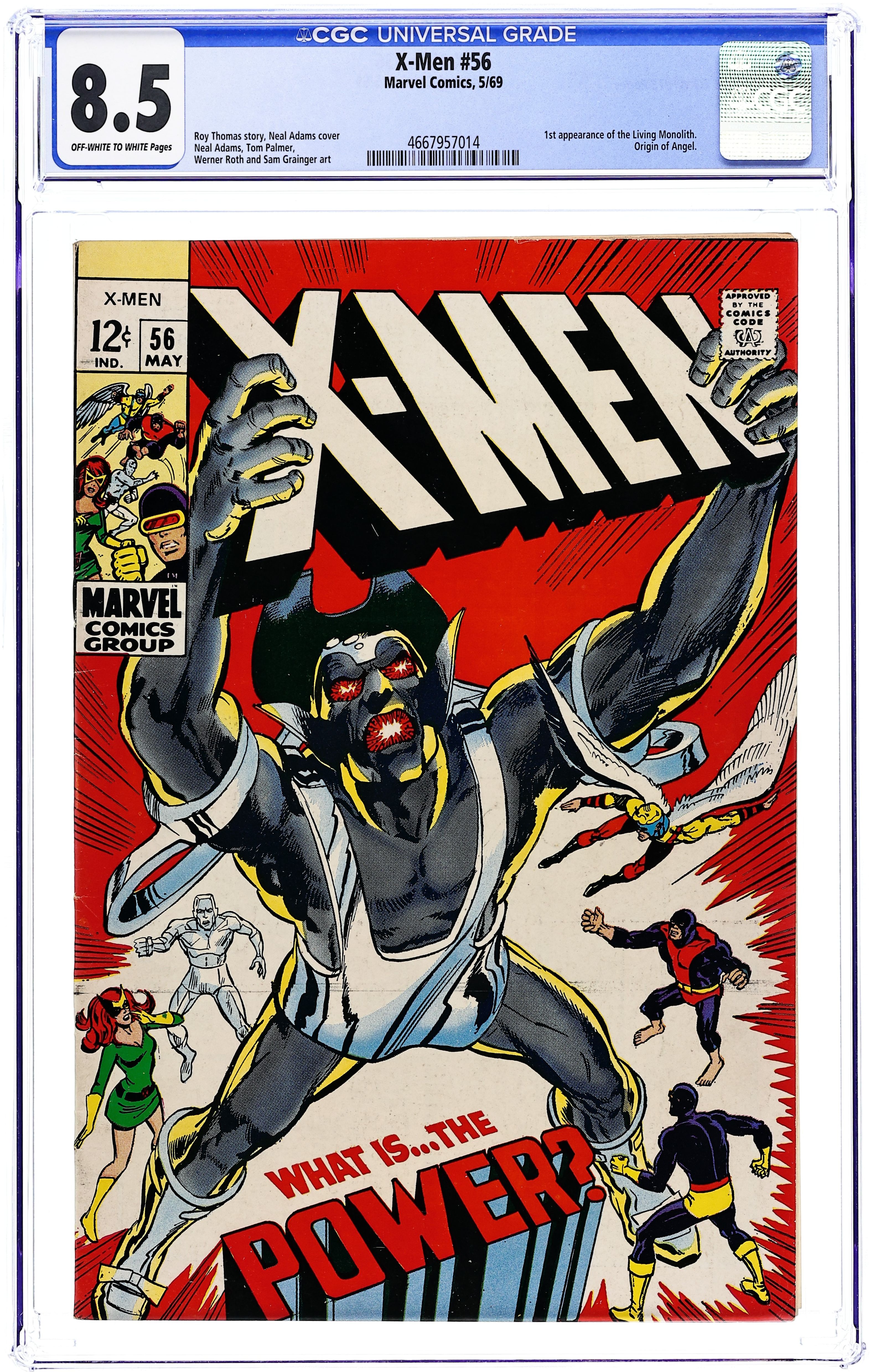 Cover art by Neal Adams. What Is...the Power?, script by Roy Thomas, pencils by Neal Adams, inks by Tom Palmer; In the Egyptian desert, the X-Men battle the Living Pharaoh and his men; The Pharaoh takes off with Alex and siphons off his mutant powers to turn himself into the Living Monolith; As the X-Men battle the Monolith, Alex turns the tables by taking back his power and more, stopping the Monolith and destroying the ancient temple where he has been trapped; Alex warns his friends to stay away as he has no control over the destructive powers coursing through his body. The Flying A-Bomb!--The Origins of the Uncanny X-Men!, script by Roy Thomas, pencils by Werner Roth, inks by Sam Grainger; conclusion of Angel's origin. 36 pgs. $0.12. Cover price $0.12.