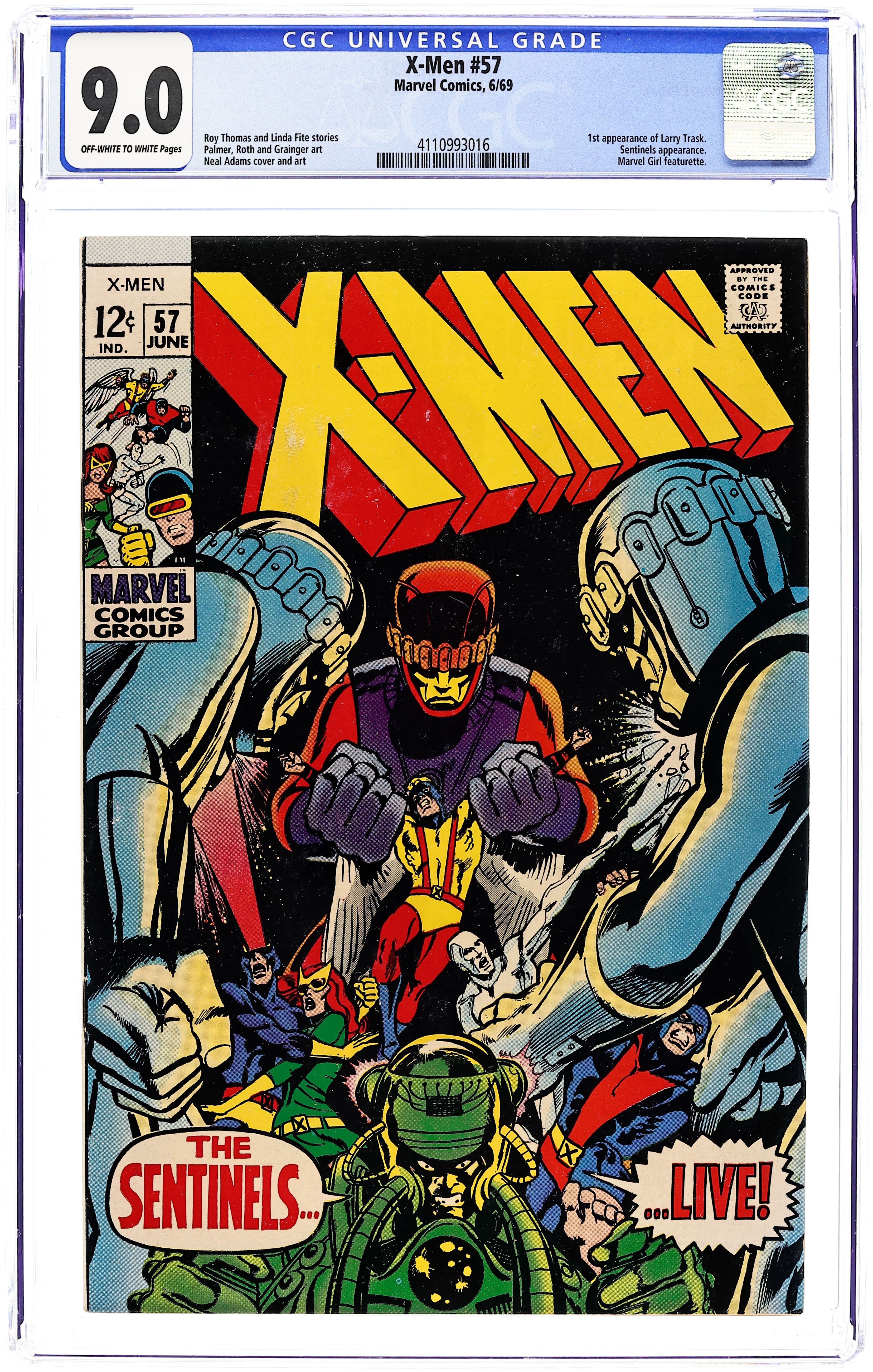 First appearance of Larry Trask. Cover pencils by Neal Adams, inks by Tom Palmer. The Sentinels Live!, script by Roy Thomas, pencils by Neal Adams, inks by Tom Palmer; Lorna is attacked by a Sentinel; Alex is paralyzed by his terrible and destructive new powers as the X-Men try to figure out how to help him; The Egyptian authorities arrive and the Living Pharaoh tells them to arrest the X-Men for the destruction of an ancient temple; Alex takes off in the conflict and is attacked by a Sentinel; Learning of the attack on Lorna, Iceman and Beast head back to the states to investigate; They catch a newscast where the son of Bolivar Trask proclaims to the world that the Sentinels are once again active and hunting for mutants. The Female of the Species!--The Origins of the Uncanny X-Men, script by Linda Fite, pencils by Werner Roth, inks by Sam Grainger; explanation of Marvel Girl's powers. 36 pgs. $0.12. Cover price $0.12.