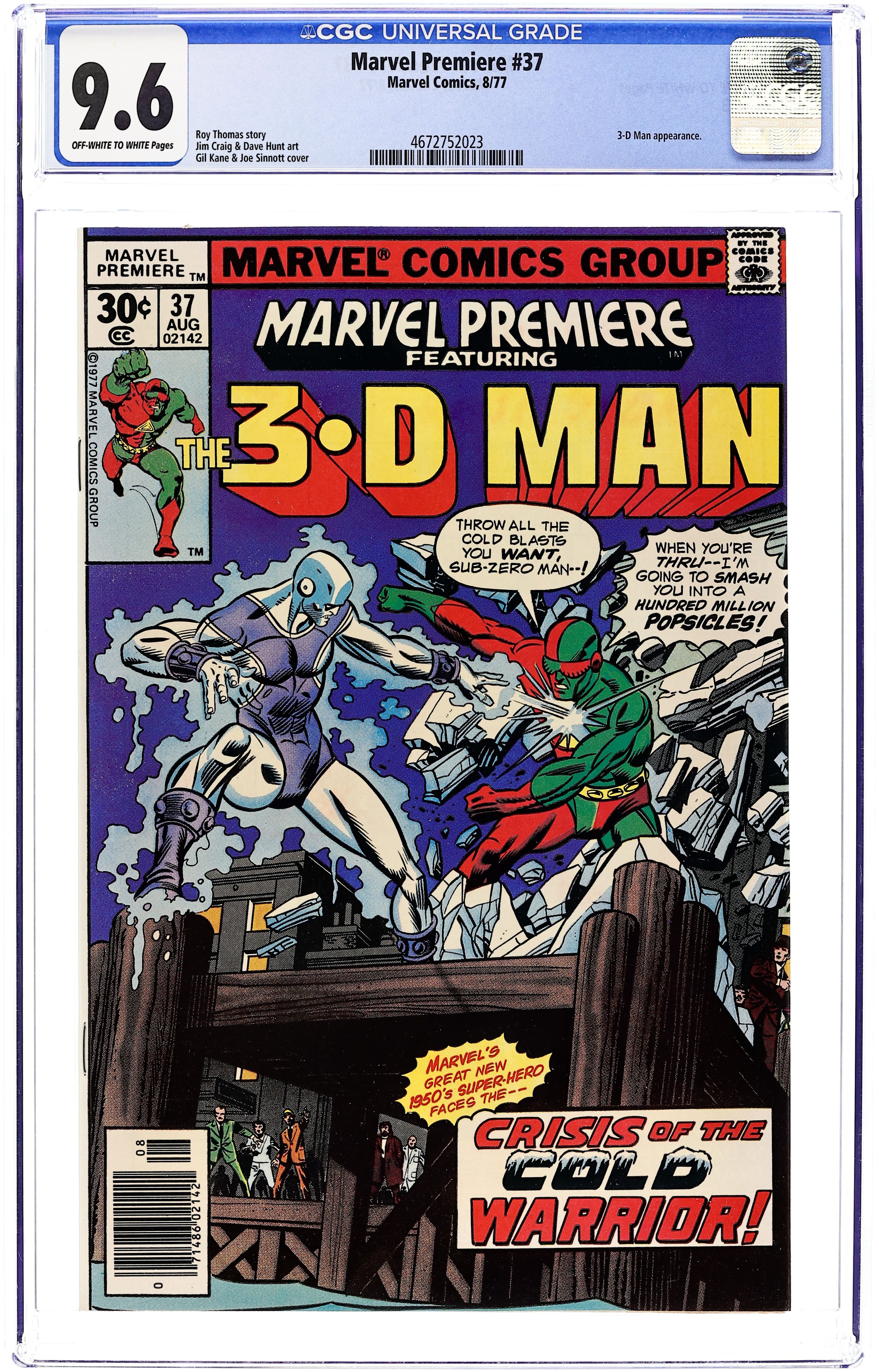 Code-Name: The Cold Warrior! - Written by Roy Thomas & Don Glut. Art by Jim Craig & Dave Hunt. Cover by Gil Kane & Joe Sinnott. Featuring the 3-D Man! Marvel's great new 1950's super-hero faces the crisis of the Cold Warrior! And the sub-zero man can throw all the cold blasts he wants, 'cause when he's through...the 3-D Man's going to smash him into a hundred million popsicles! Also starring Zirksu, Vince Rivers and Richard Nixon. 32 pages, full color. Cover price $0.30.