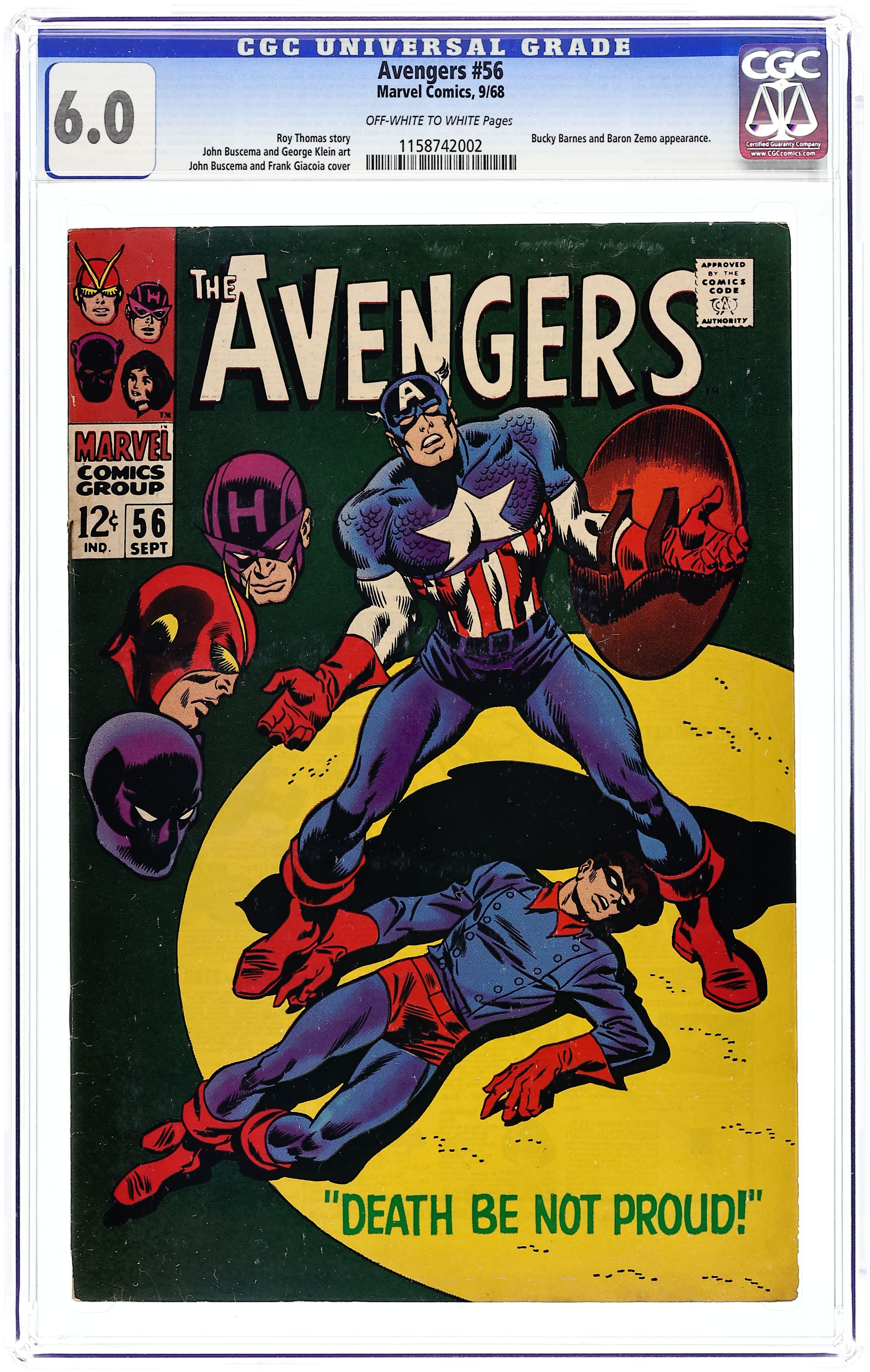 "Death Be Not Proud!" Script by Roy Thomas. Pencils by John Buscema. Inks by George Klein. Cover by John Buscema, George Klein, and Frank Giacoia. In recent days Steve Rogers has been having doubts about the final fate of his WWII partner, Bucky Barnes. Cap is fairly certain that Bucky died while trying to stop Baron Zemo's drone plane, but he's not completely sure. So the Living Legend asks his fellow avengers to meet at Dr. Doom's castle and go back in time with him to 1945! When the Wasp turns the dial on the time platform, the Avengers' journey to World War II-era England begins! Good luck against Baron Zemo! But beware... sometimes the past is best left alone! Story continues in Avengers (1963 1st series) Annual #2. Avengers Lineup: Black Panther, Captain America, Goliath, Hawkeye, and the Wasp. (Notes: The letters page includes a letter from comics historian Peter Sanderson. This issue was reprinted in Marvel Super Action #15.) 32 pages. Cover price $0.12.