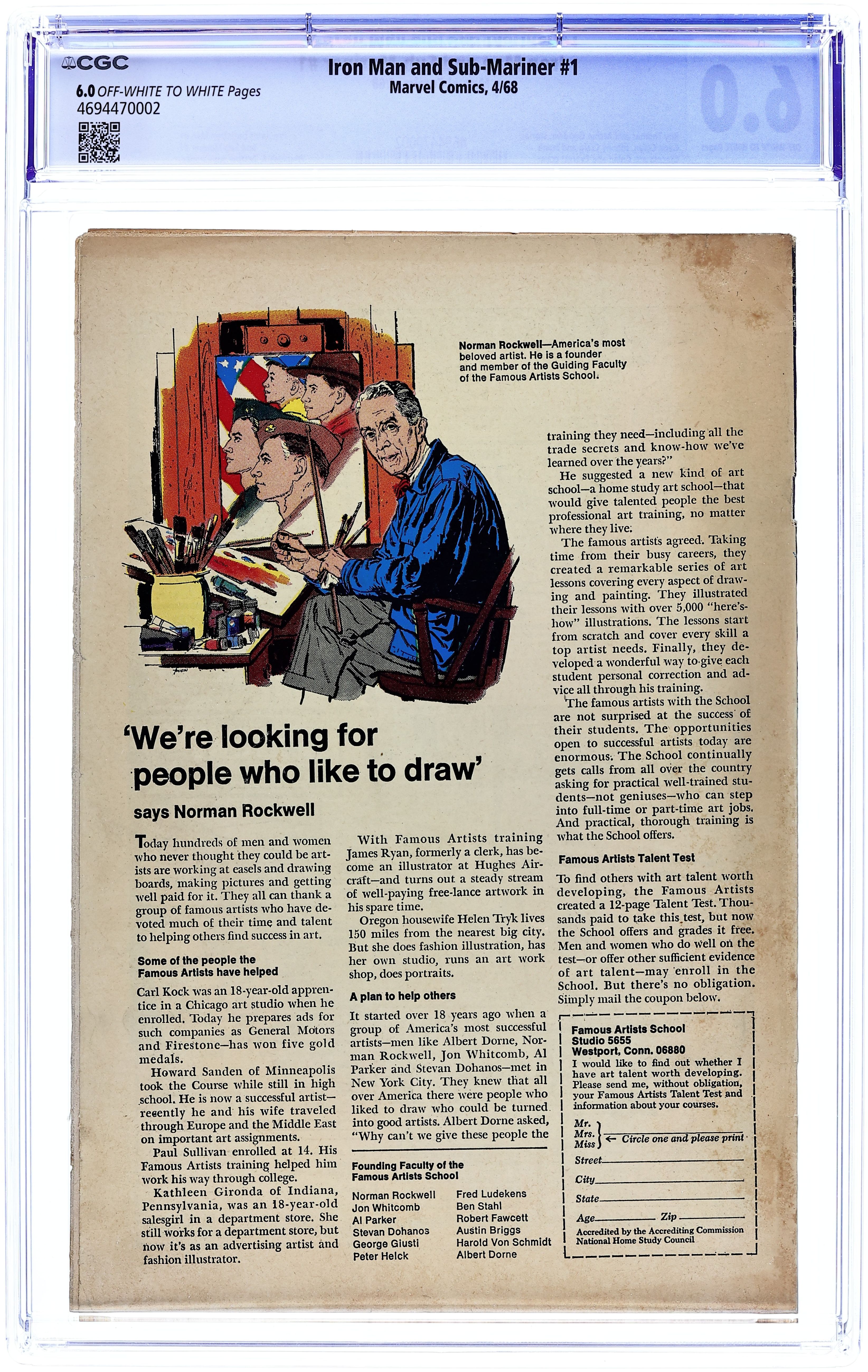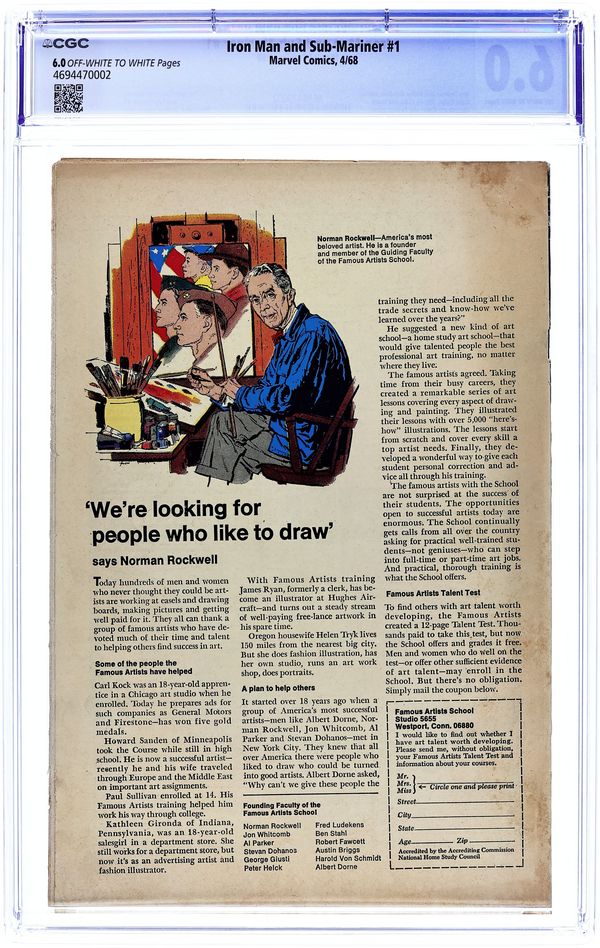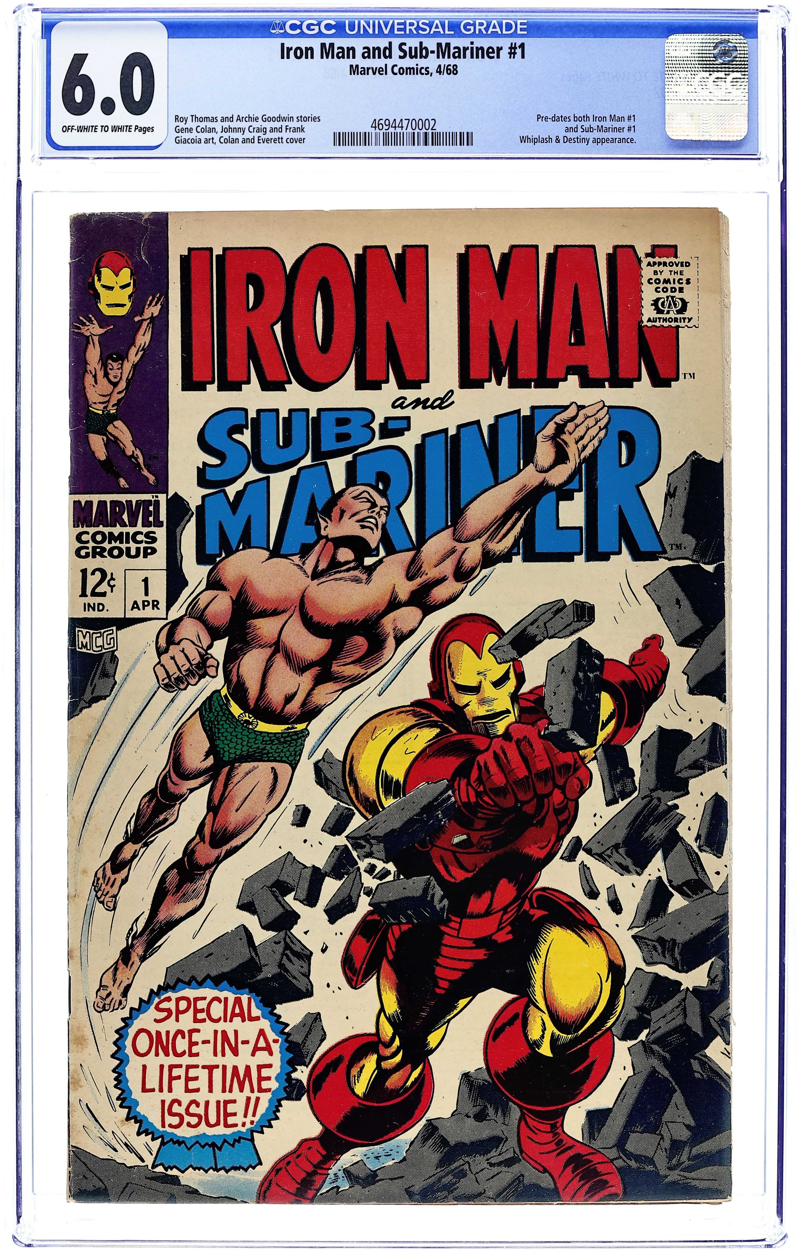 Cover pencils by Gene Colan, inks by Bill Everett. "The Torrent Without - The Tumult Within!," script by Archie Goodwin, pencils by Gene Colan, inks by Johnny Craig; Iron Man escapes from the trap set up by Whiplash and the Big M when a cadre of AIM agents attacks the Maggia's gambling ship. "Call Him Destiny... or Call Him Death!," script by Roy Thomas, pencils by Gene Colan, inks by Frank Giacoia; As Namor battles Destiny, the villain recounts his past connection to Namor's father. Pre-dates both Iron Man #1 and Sub-Mariner #1; Iron Man story continues in Iron Man #1, while the Sub-Mariner story continues in Sub-Mariner #1. 36 pgs., full color. $0.12. Cover price $0.12.