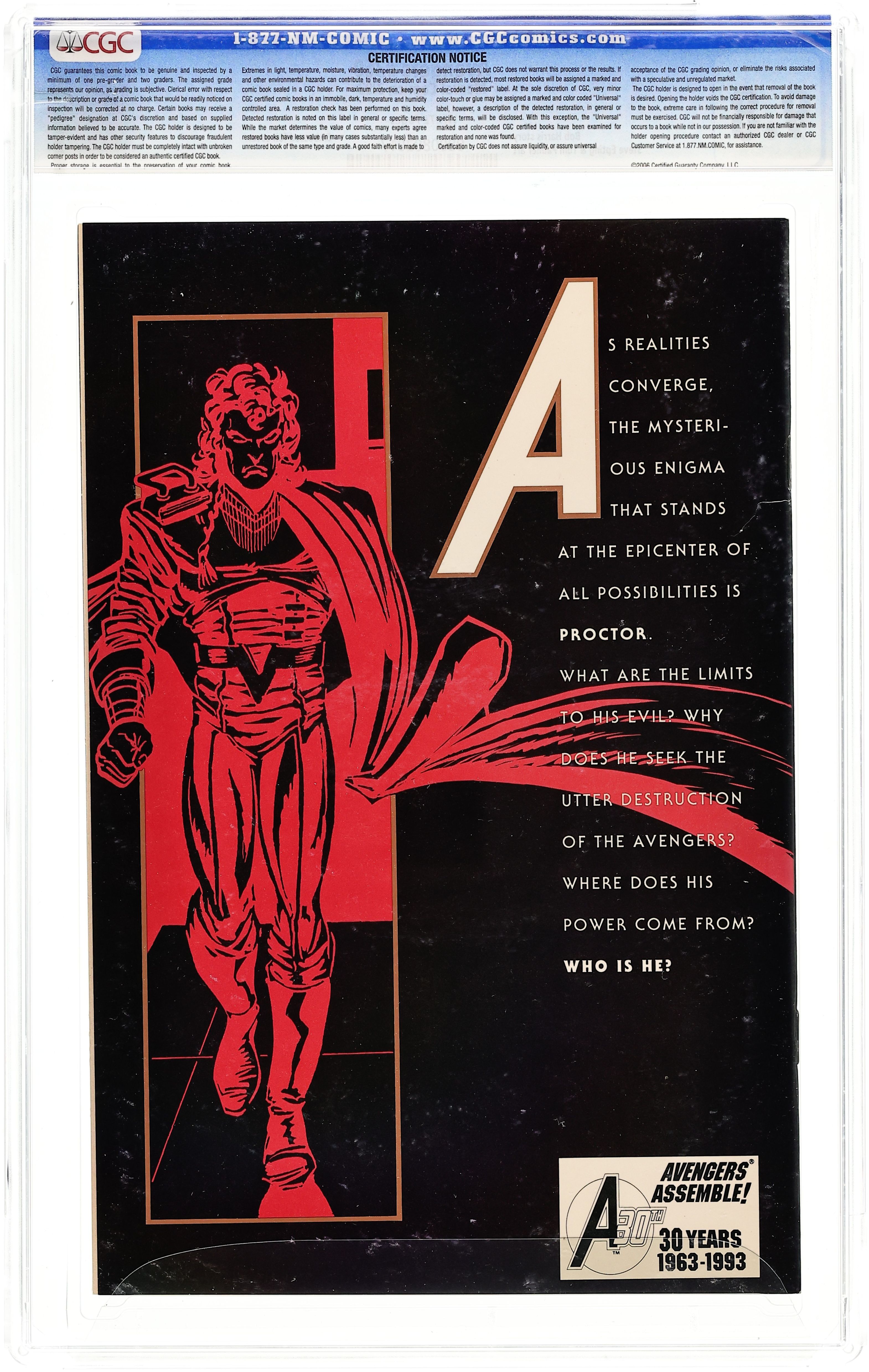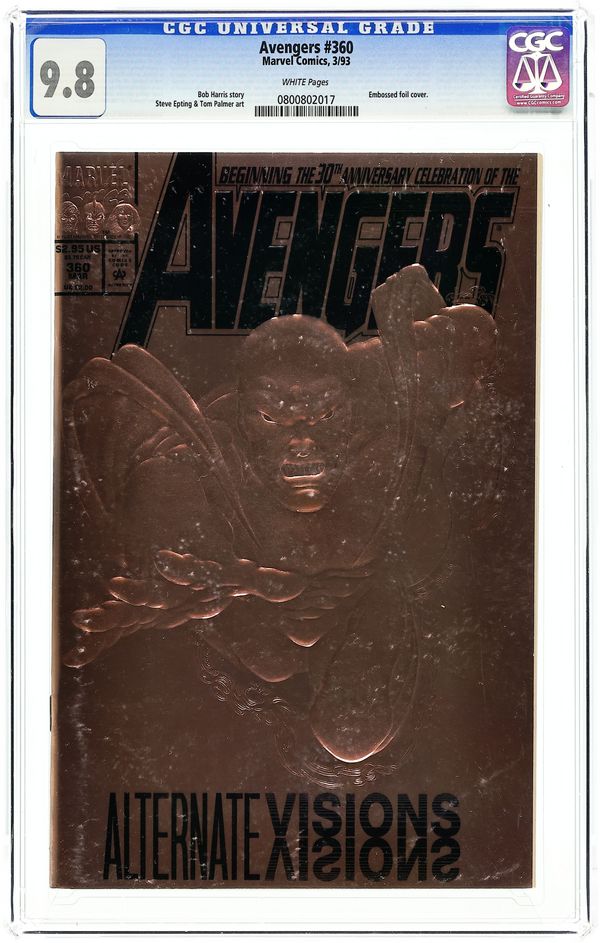 Rare Silver Foil Error Variant. This copy was manufactured without the copper/bronze tint to the foil; very few copies are known to exist! "Alternate Visions" Script by Bob Harras. Pencils by Steve Epting. Inks by Tom Palmer. Embossed cover by Steve Epting and Tom Palmer. Inside the citadel of the Gatherers, Proctor holds his newest avenger captive! The Vision! What diabolical plan does Proctor have in store for the synthezoid avenger? A simple one really. Transplant the Vision's artificial mind into another Vision from an alternative reality! And send the new "evil" Vision to kill the Avengers! A synthetic wolf in sheep's clothing! With Earth's Mightiest Heroes in disarray (after Sersi's rash behavior last issue), will the Vision's teammates even notice the change? First appearance of the Anti-Vision. Cameo appearances by Captain America, Lockjaw, and the Swordsman. Backup feature: "Overviews" Script by Bob Harras. Art by Hector Collazo. Designs by Suzanne Gaffney. The Black Widow brings Cap up-to-date on everything he's missed with the Avengers over the past several weeks. Avengers Lineup: Black Knight, Black Widow, Crystal, Hercules, Sersi, and the Vision. (Notes: This issue begins the 30th anniversary celebration of the Avengers. The Vision returns to his familiar red-hued body for the first time since West Coast Avengers 40. This issue includes a two-page Avengers pin-up by Ron Frenz and Tom Palmer. 52 pages Cover price $2.95.