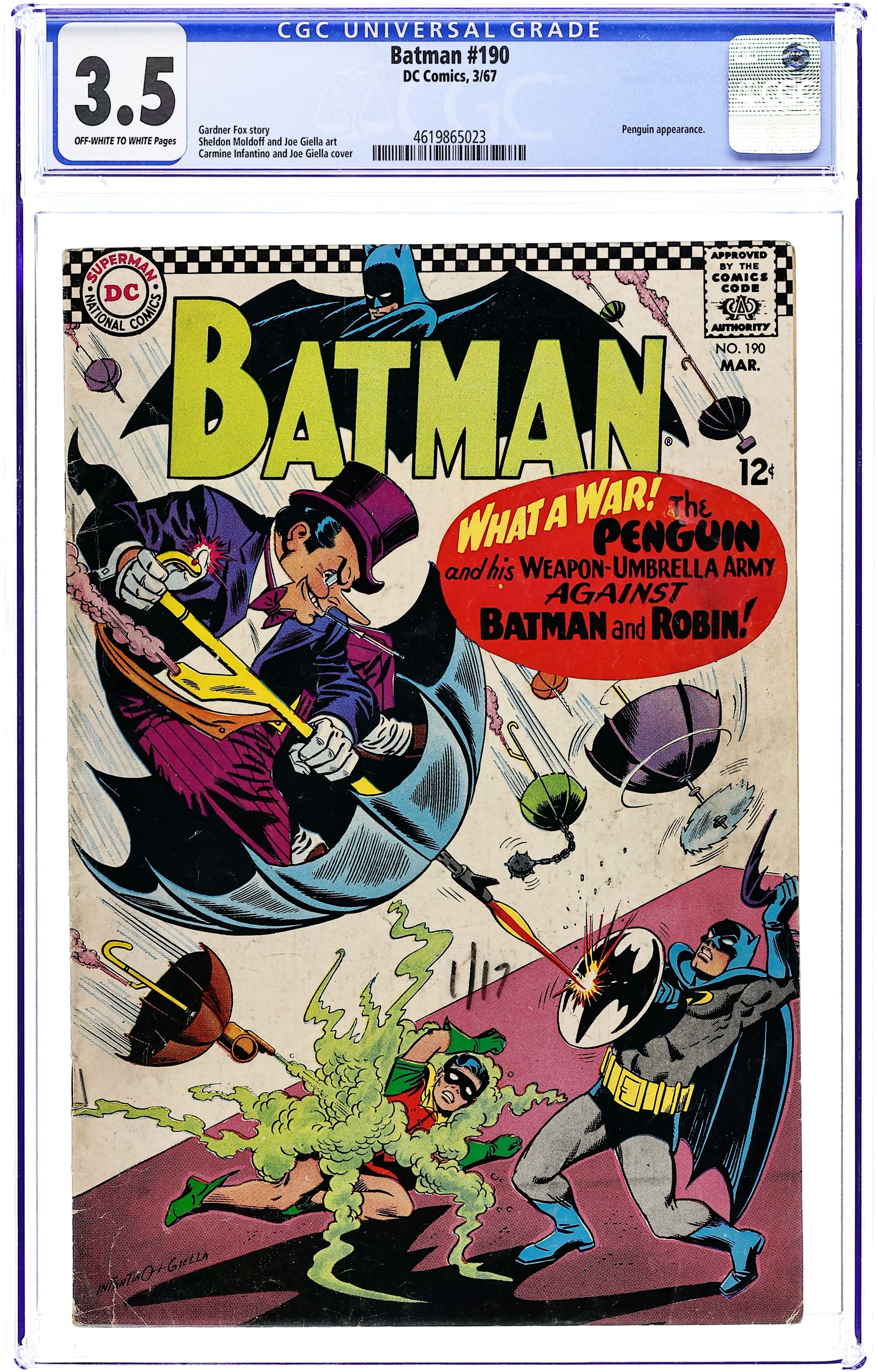 Starts Apr 4 Cover pencils by Carmine Infantino, inks by Joe Giella. "The Penguin Takes a Flyer--Into the Future!", script by Gardner Fox, pencils by Sheldon Moldoff (as Bob Kane), inks by Joe Giella; Penguin attempts to fool the Caped Crusaders into believing that his new tricks are based on futuristic technology. When this fails and his gang is captured the Fowl villain begins using robotic umbrellas against the Dynamic Duo. Letters from letter hack Guy H. Lillian III and Marvel colorist and assistant editor Irene Vartanoff. Cap's Hobby Hints activity half-page by Henry Boltinoff. Countdown on Excellence public service, script by Jack Schiff, art by Sheldon Moldoff; Jerry gets a lecture from his father on the importance of doing every job right. 36 Pages, Full Color. Cover price $0.25.