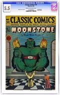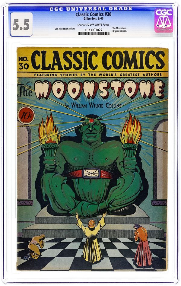 The Moonstone, 1st Printing. Rico cover and art, Classics Comics. (HRN 30, 9/46). Moonstone by William Wilkie Collins (1 page bio after story). Adaptation by Dan Levin, cover and interior story penciled by Don Rico, back cover ad for Classic Comics Gift Boxes. Cover price $0.10.