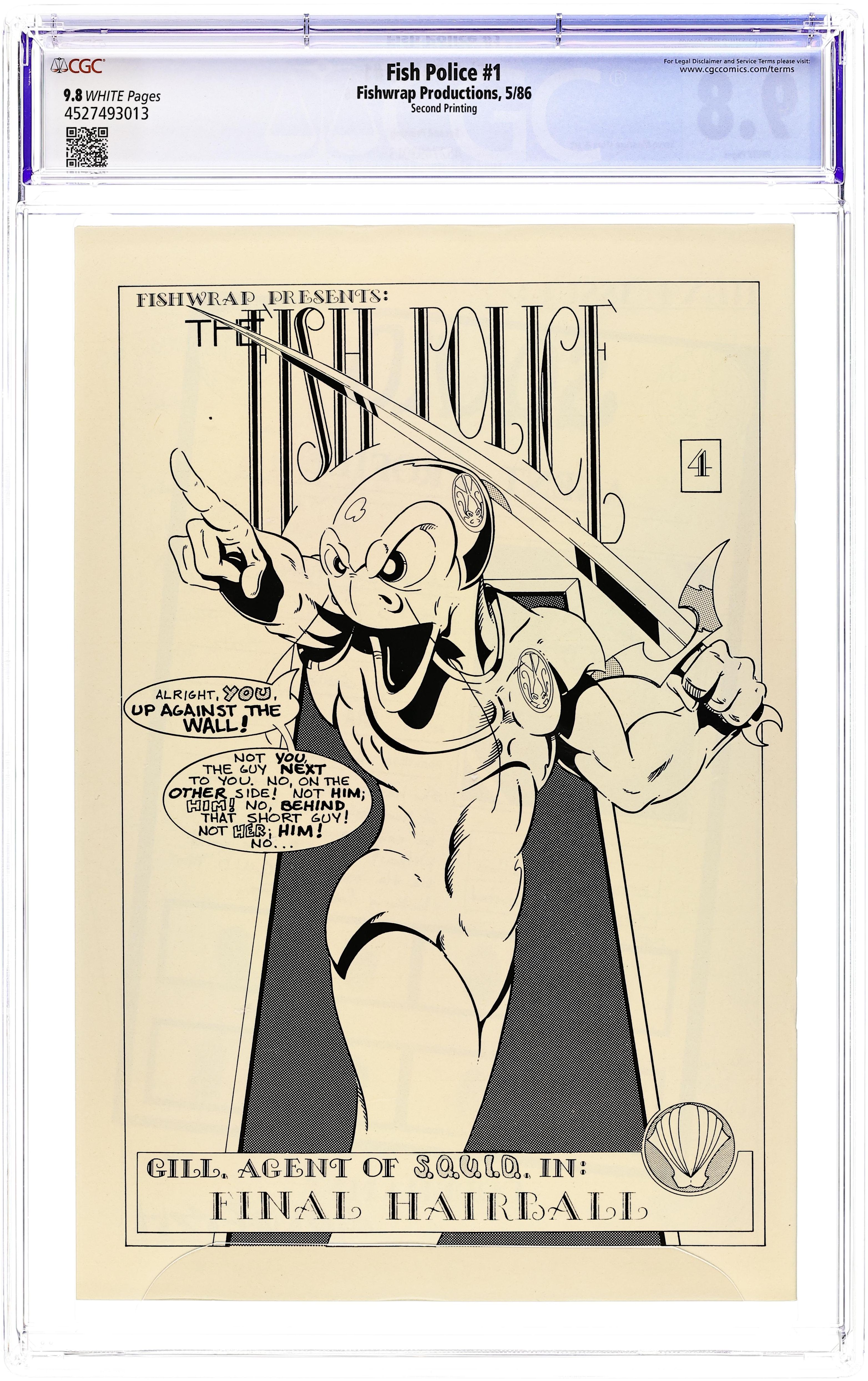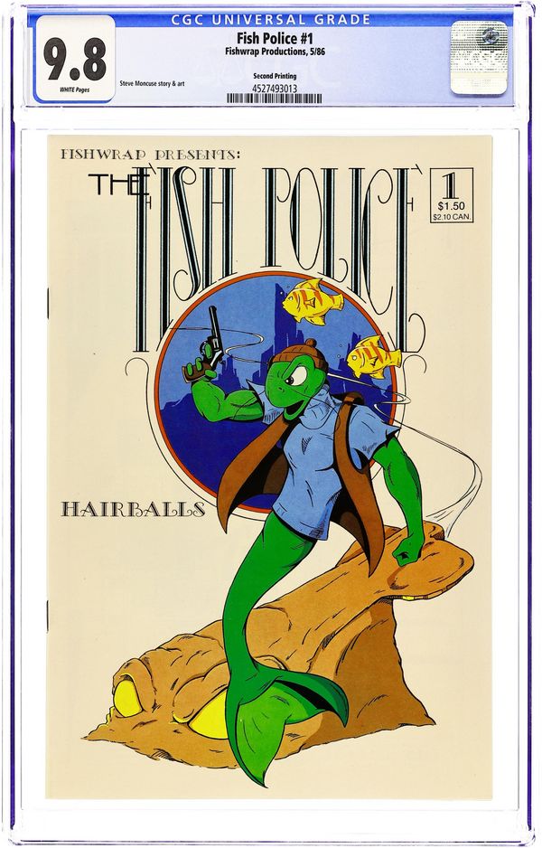 May 1986 reprint. Inspector Gill is very interested when a mysterious female wants him to help her uncle Dr. Calamari, a scientist who is working a drug that will enable fish to live in the world filled with people who walk on two legs in "Hairballs." Script and art by Steve Moncuse. Cover price $1.50.