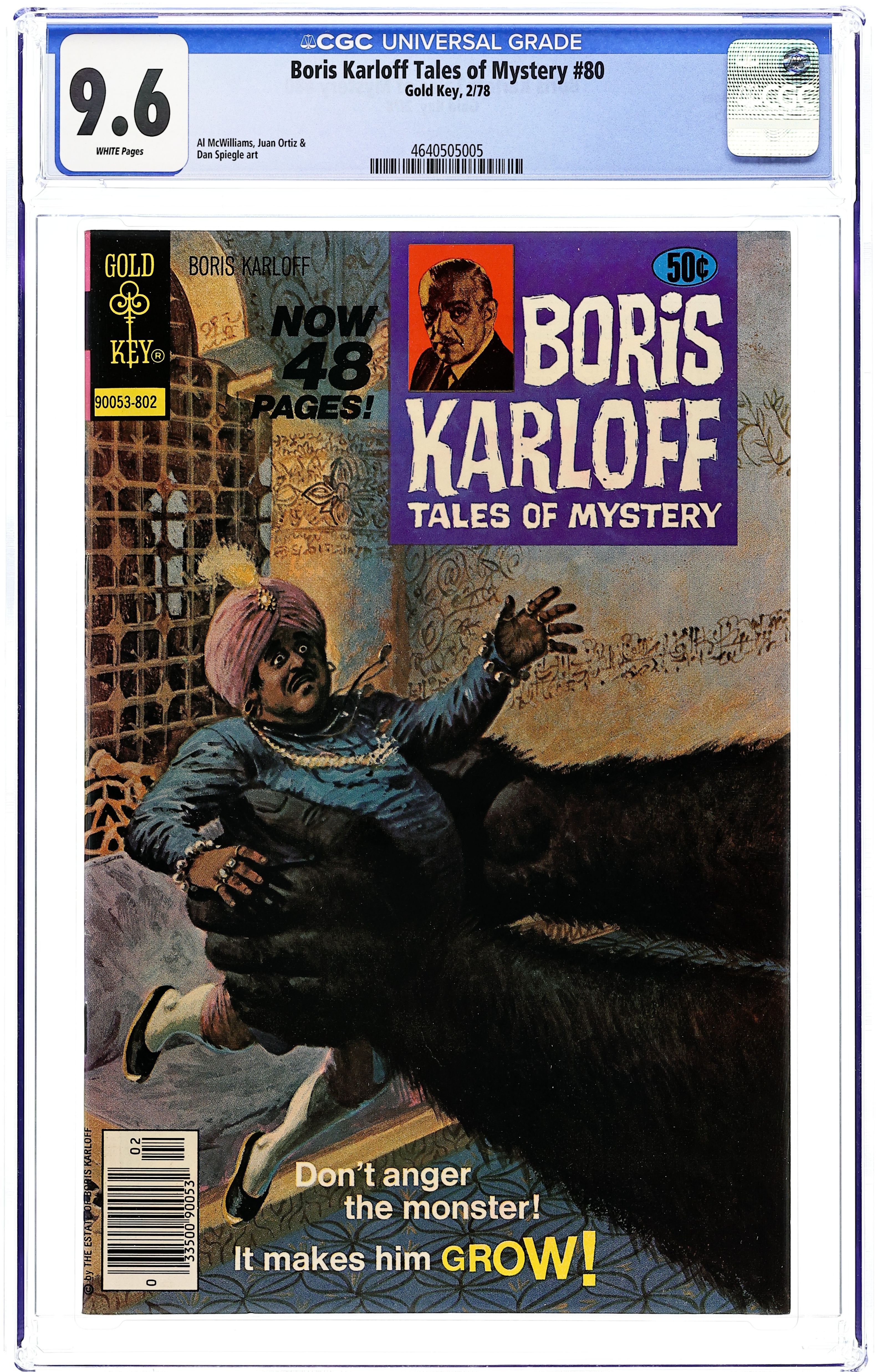 Anthology type comic with spooky and mystery stories hosted by famous classic horror film actor Boris Karloff. This issue features "Something from the Past," The Menace of the Missing Mummy," "Lo! The Mighty Hunter" and "Burn, Witch, Burn." Issue also has one- page text feature "The Incredible Thinking Machines" and one-page strips. No story/art credits given. Back cover is pinup of front cover illustration. On cover: 10053-307, July. Cover price $0.12.