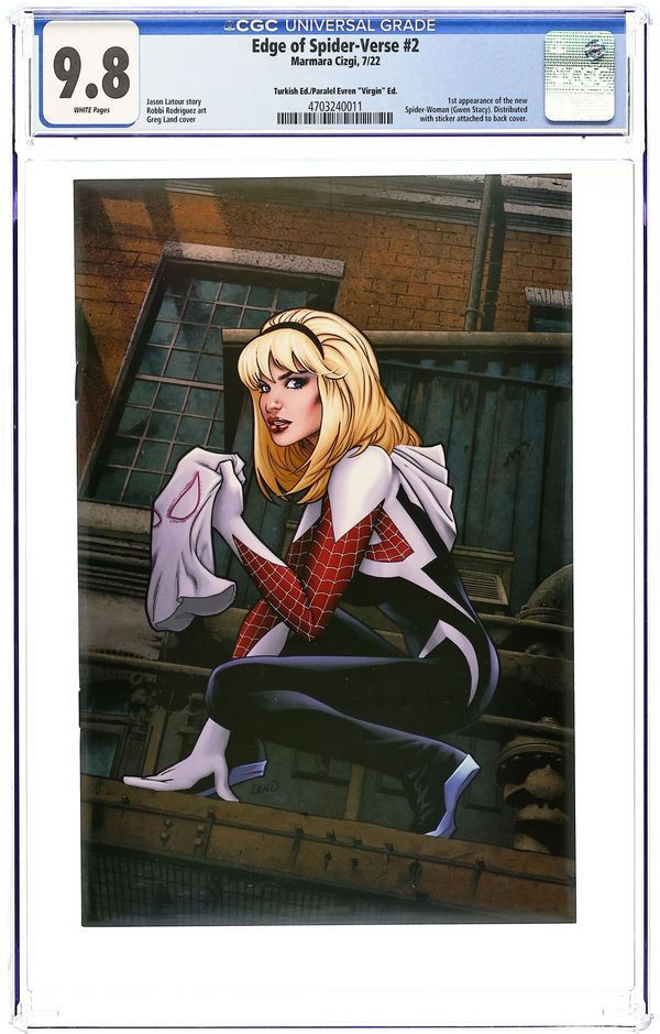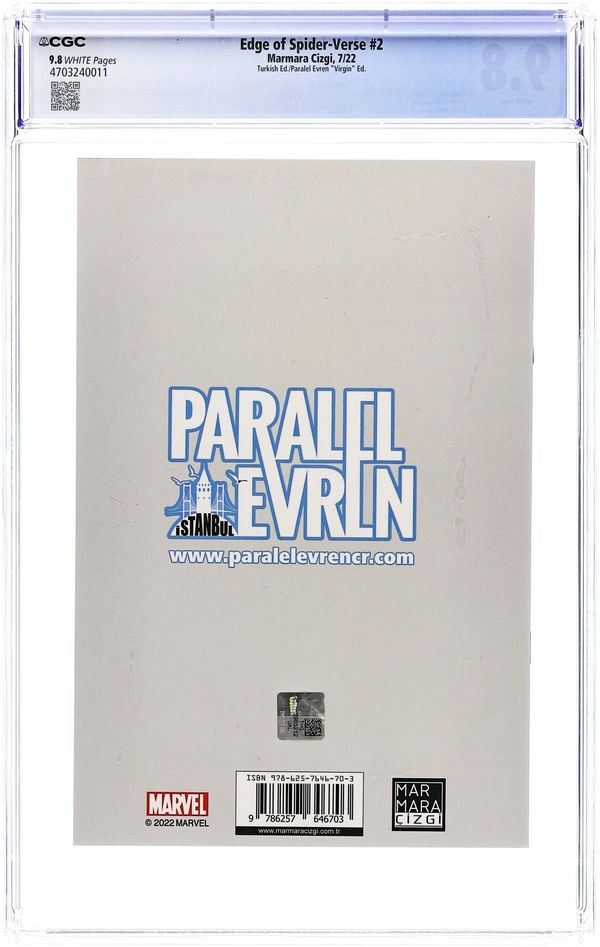 Turkish Edition Reprint Series. Paralel Evren Exclusive Virgin Cover by Greg Land. Reprints Edge of Spider-Verse (2014 Marvel) #2. Story by Jason Latour. Art by Robbi Rodriguez. 6 1/4" X 9 1/4". Turkish Language.