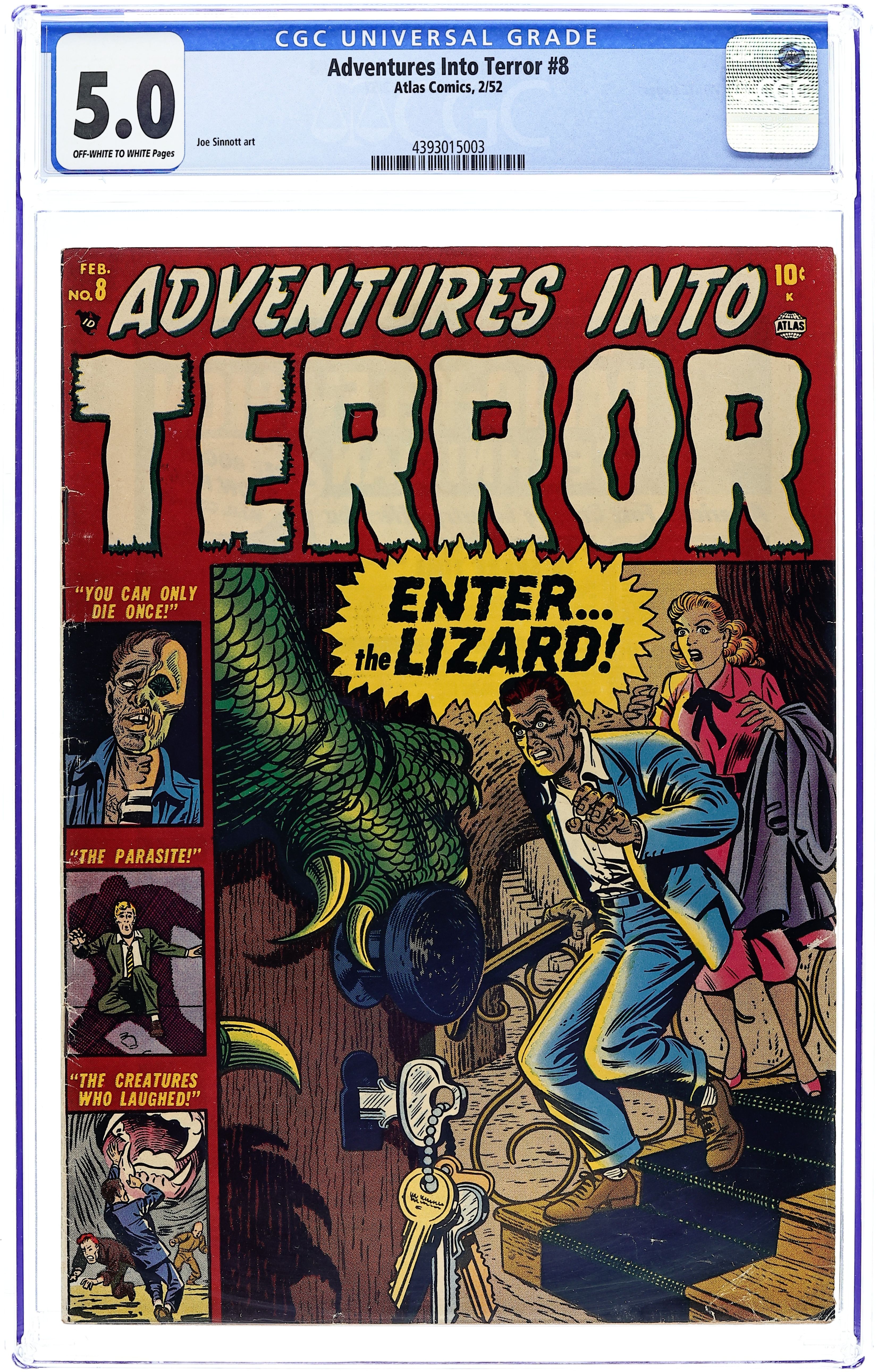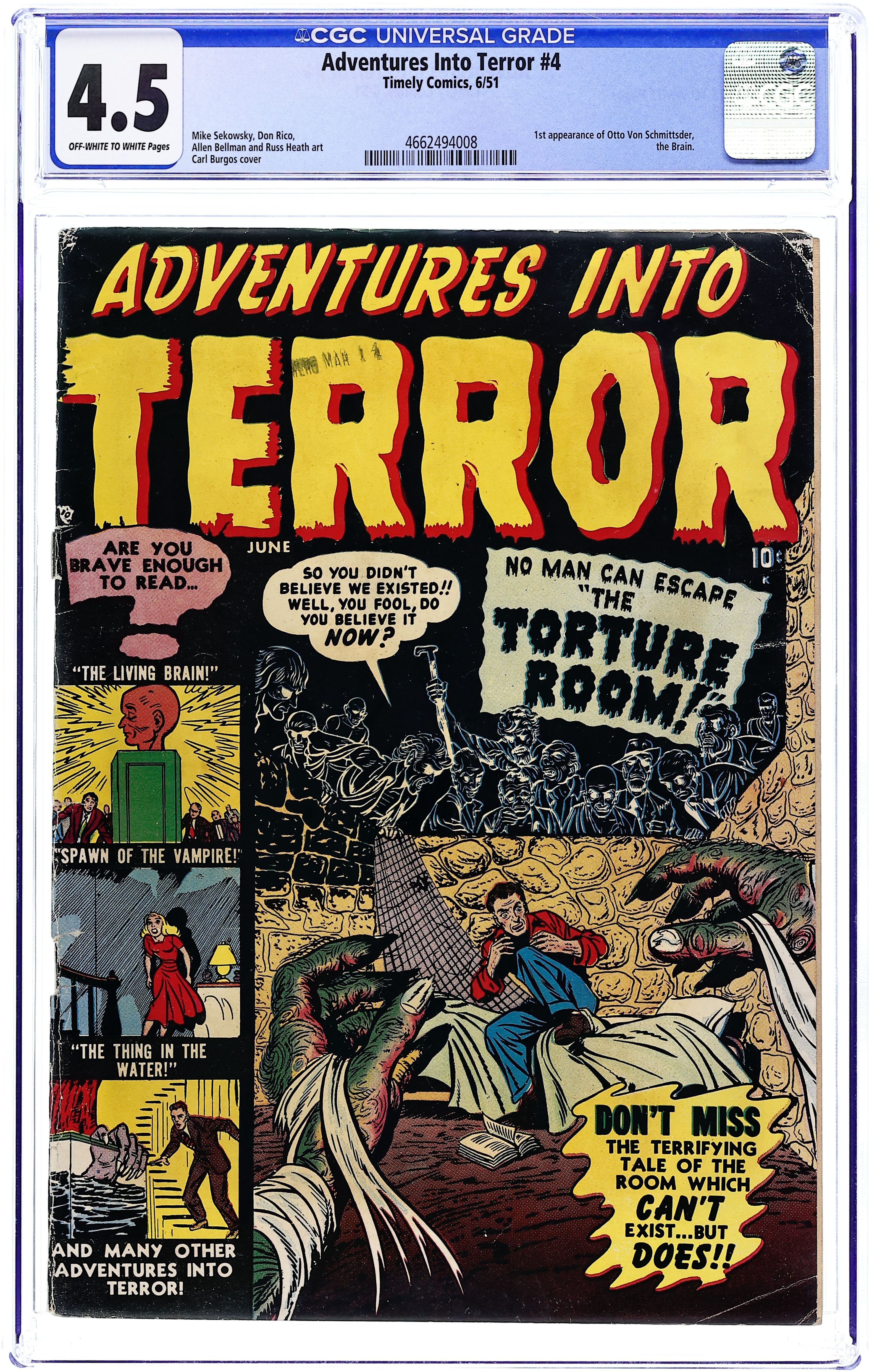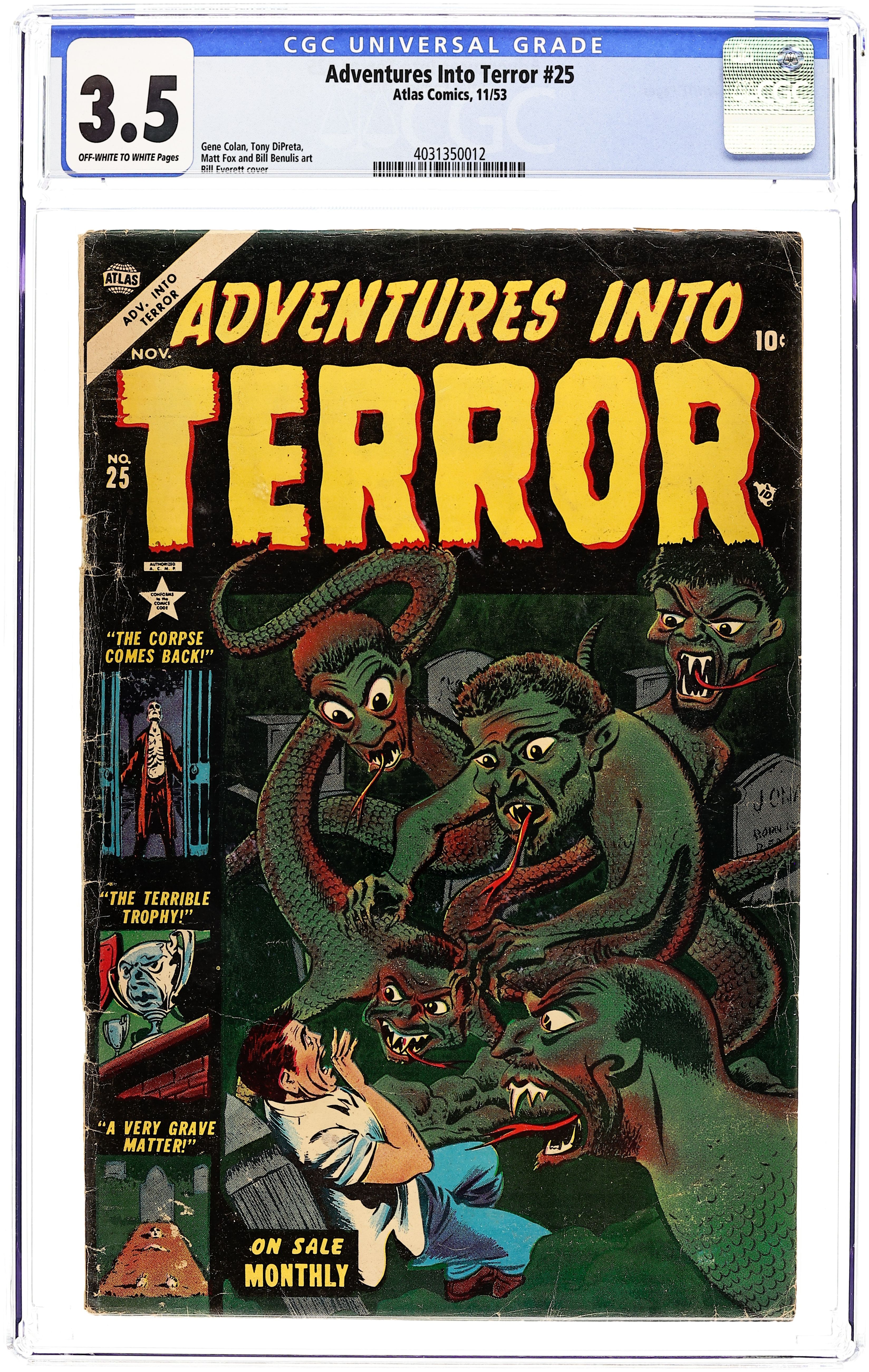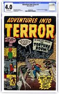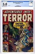 Edited by Stan Lee. Cover by Carl Burgos. Stories by Russ Heath, Paul Reinman, Stan Lee, Joe Maneely, Paul S. Newman, Chuck Winter, Bill Benulis, and Jack Abel. Weird tales of horror and suspense—prepare yourself for Adventures into Terror! 36 pages, full color. $0.10. Cover price $0.10.