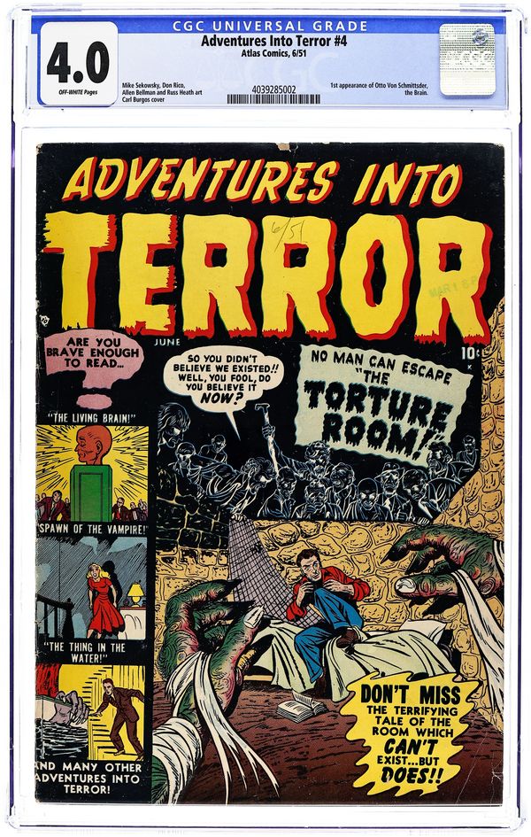 The Brain!, art by Russ Heath; A warped Nazi scientist, sentenced to death, has an assistant dig up his body, remove his head and keep it alive in his laboratory. He makes plans for world domination (follow-up story in Adventures into Terror #6). Hands of Murder, pencils by Mike Sekowsky, inks by Christopher Rule; A young woman fears that her late sister has come back from the grave to kill her. Vampire Ship text story. Torture Room, art by Don Rico; the Nazi commander of a concentration camp is captured by the prisoners and placed in their secret torture room. Vampire Brats, pencils by Allen Bellman; A nurse gets a job at an infants' home where all the babies seem just a little different. The Thing in the Water; A fish enthusiast encounters a menacing "water monster" from Atlantis when he brings home a new breed of guppies. 36 pgs. Cover price $0.10.