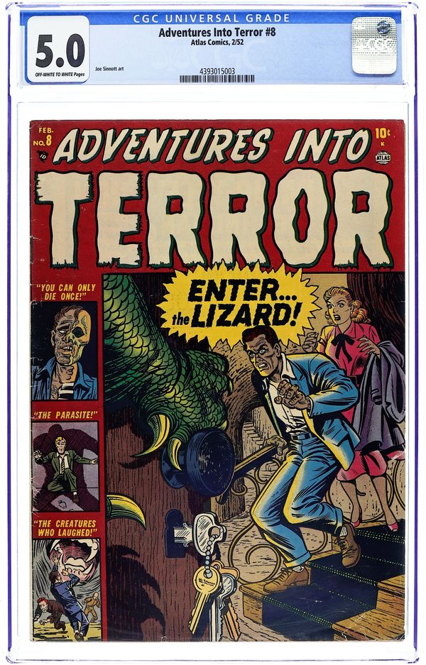 The Lizard prototype cover/story in "Enter…the Lizard," pencils by Harry Lazarus; A man discovers a type of werelizard that reproduces its kind by injecting humans with a poison in its bite that transforms their bodies. The Nesterfield Horror text story. The Parasite, script by Hank Chapman, pencils by Bill Walton. You Can Only Die Once, pencils by Manny Stallman; A man tries to kill himself over and over again but only succeeds in producing pain and mutilation, not the longed for oblivion. The Miracle, pencils by Bill LaCava; A criminal in a bar at night sees a stranger doing wondrous things and so he pulls a gun and demands to know how they are done. The Ones Who Laugh, pencils by Joe Sinnott. 36 pgs. Cover price $0.10.