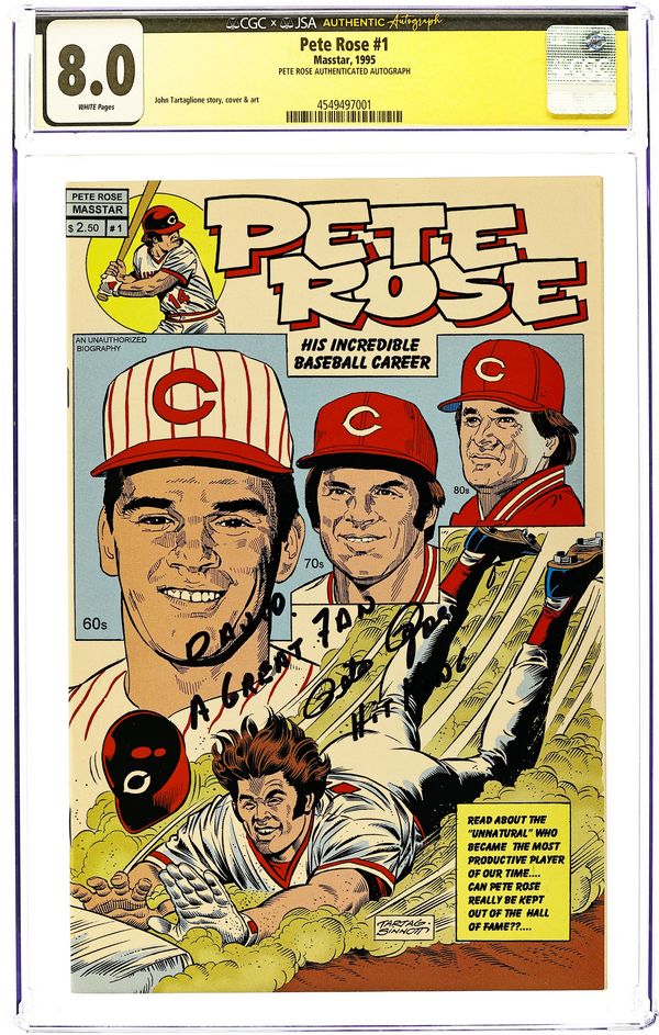 Story, Art, and Cover by John Tartaglione. A comic book chronicling the career of famed baseball player of the Cincinatti Reds, Pete Rose. Cover price $2.50.