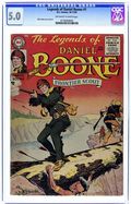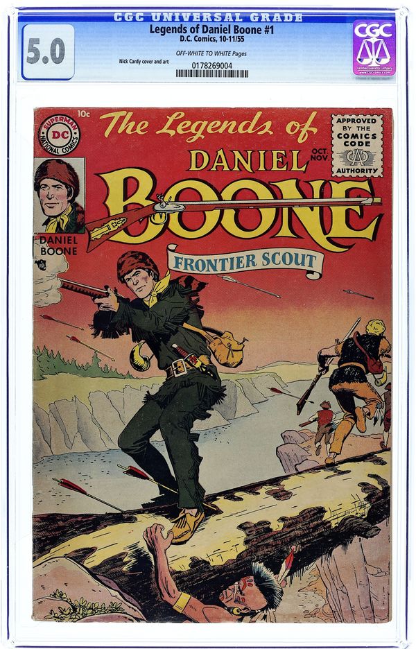 Written by unknown. Art and Cover by Nick Cardy. Daniel Boone, frontier scout, stars in three tales with art by Nick Cardy: "Buckskin Decoy!"; "The Fugitive of Cherokee Point"; and "Boone -- Son of Chief Black Fish"! Plus: Sagebrush Sam humor 1-pager by Henry Boltinoff; 2-page text story "Peril for a Pony Rider"; Buck Skinner humor 1-pager by Henry Boltinoff; and non-fiction 1-pager "End of a Tribe!" 36 pages, full color. Cover price $0.10.