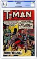 Cover by Reed Crandall. Stories by unknown. Art by Dan Zolnerowich and unknown. In this issue: T-Man in "Mr. Murder of the Black Hand" with pencils by Dan Zolnerowich - Trask poses as manager for the ex-girlfriend of Mafia boss Racelli to get to the killer of a fellow T-Man; T-Man Tom Roccola in "The Dope Ring and Revolution"; T-Man in "Narcotics from Nobody" with pencils by Dan Zolnerowich - Stores had been smashed and citizens assaulted in Germany by American soldiers drugged by Russian cigarettes; 1-page T-Man Ray Brady text story "Intercepted Peril"; and T-Man in "Torture of the Brass Bowl" with pencils by Dan Zolnerowich - Somewhere in Hong Kong, Chinese Reds held the daughter of a wealthy San Francisco merchant, threatening her with death unless they collected blood money. 32 pages, full color. Cover price $0.10.