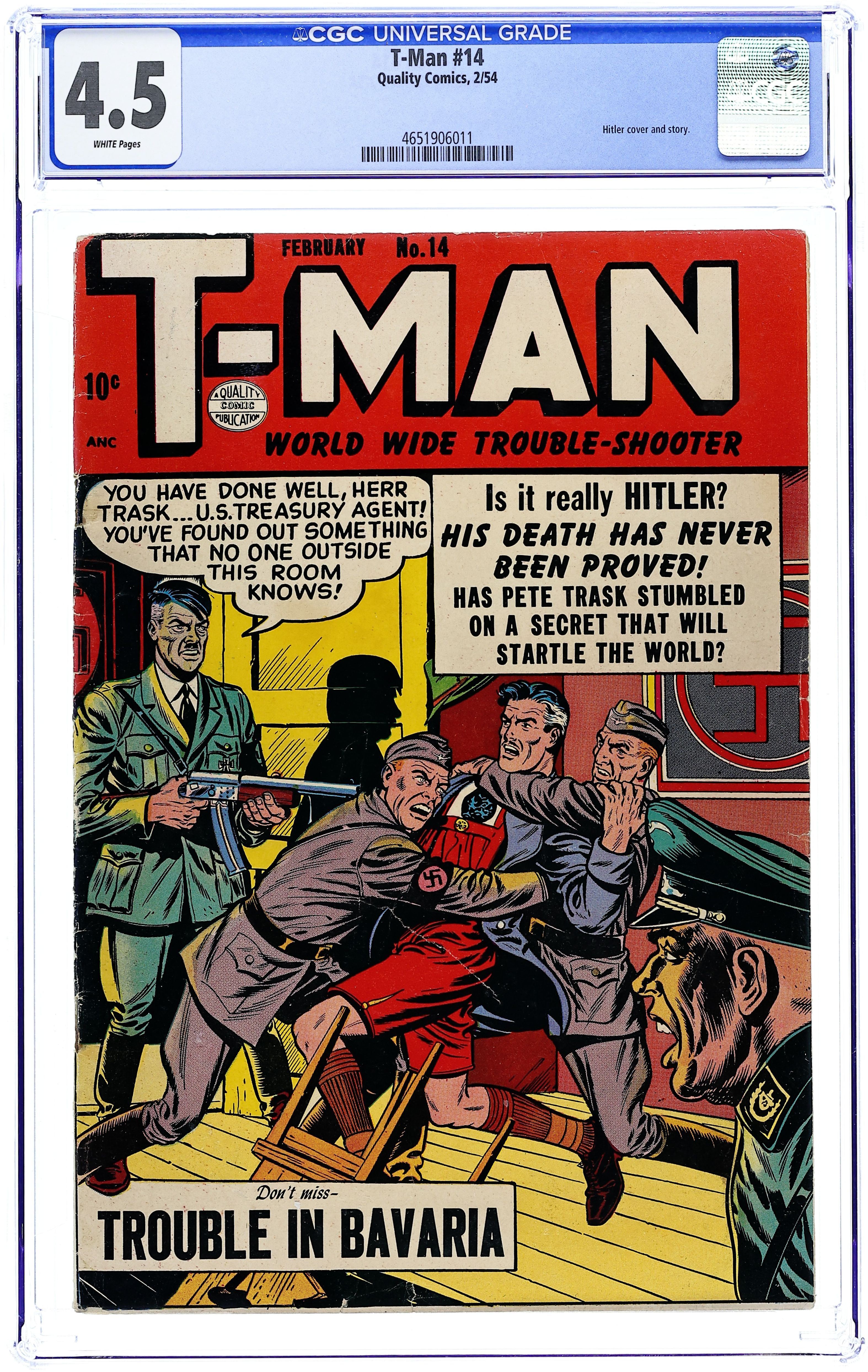 Stories by unknown. Art by Charles Sultan and unknown. U.S. Treasury Agent Pete Trask has found out something that no one outside that room knows! But is it really Hitler? His death has never been proved! Has Trask stumbled on a secret that will startle the world? Find out in "Trouble in Bavaria"! Also on this issue: T-Man in "Ultimatum of Doom!"; T-Man Tod Ellis in "The Case of the Merry Murderer" with art by Charles Sultan; 1-page text story "The Killer Who Wasn't There"; and T-Man in "Border Incident"! 32 pages, full color. Cover price $0.10.