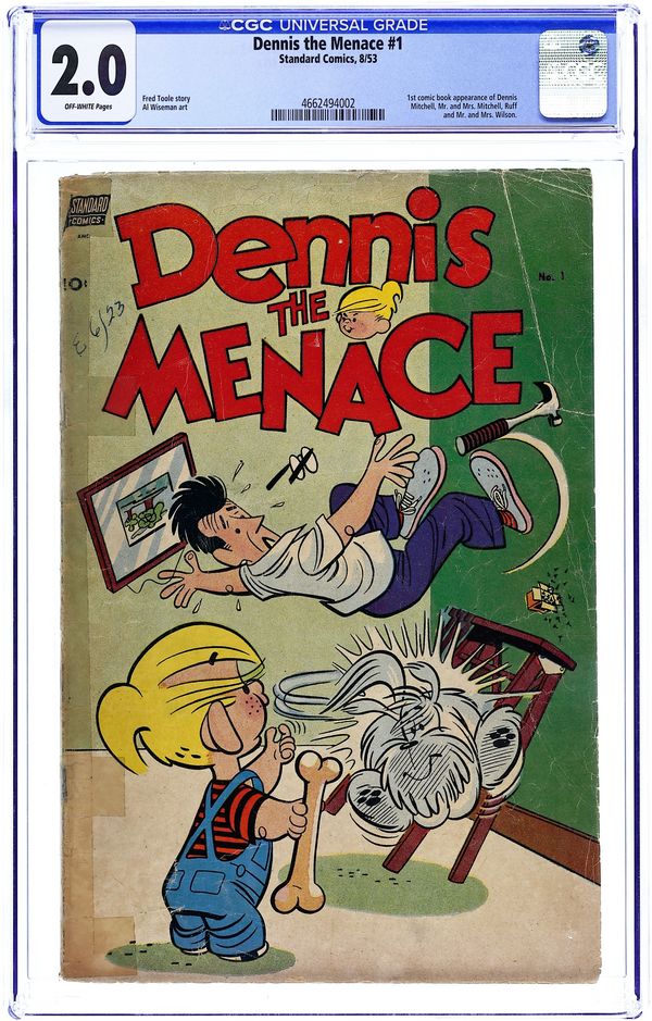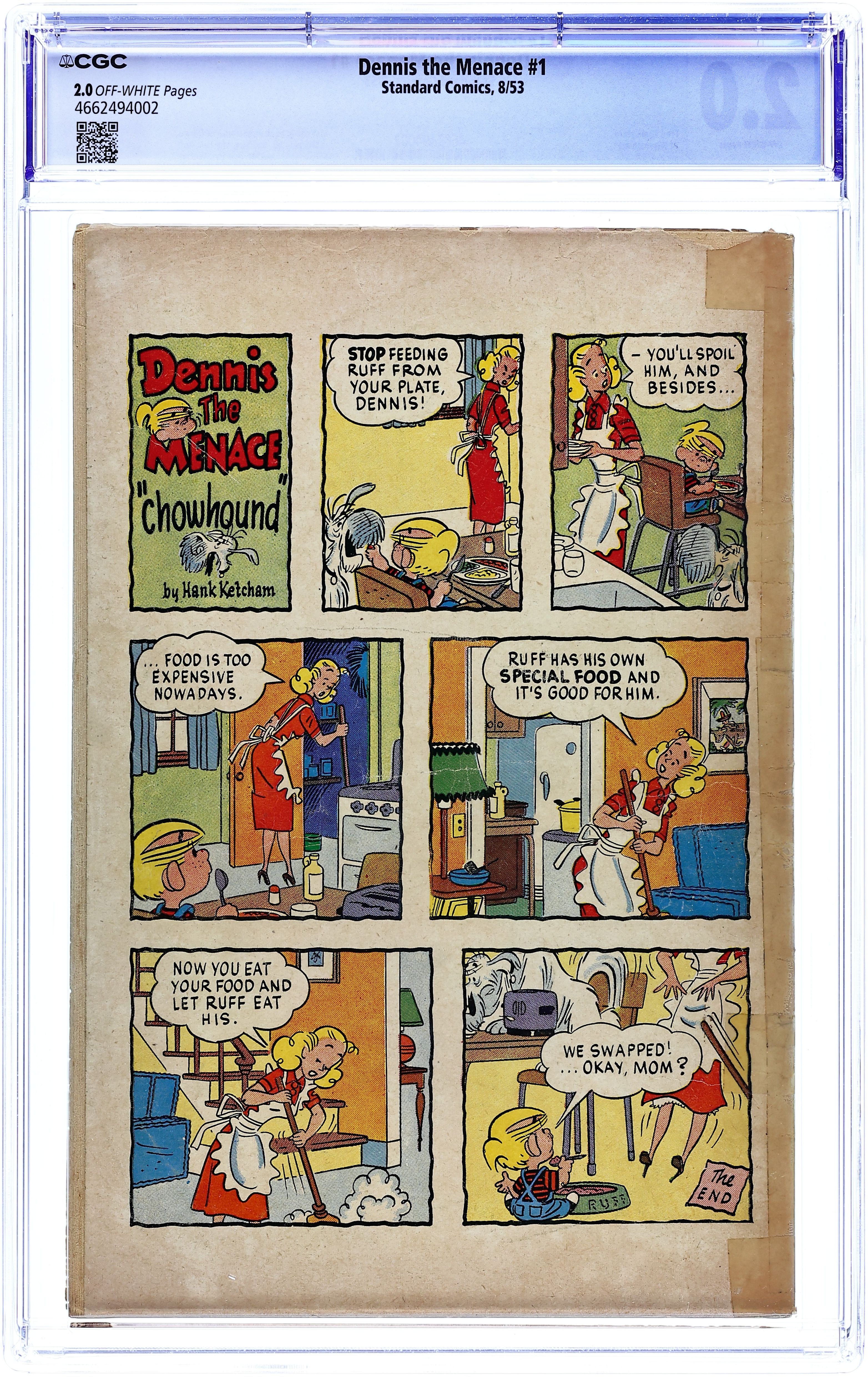 Cover by Hank Ketcham. Stories and art by Hank Ketcham and Al Wiseman. Five-year-old Dennis is a concern to his parents, a crisis to his teachers, and a menace to grumpy neighbor Mr. Wilson. Dennis enlists his friends to catch a bank robber when he hears that the reward is 100,000 ice cream cones. Henry gets pulled over after Dennis tries to steer the family car. Dennis spends the afternoon at the zoo, much to the animals' regret. Half-Pint G-Man!; Dennis Mows Em Down; Pome Pages; Driving Crazy; Dennis Vs. the Zoo; Dennis Vs. the Hiccups; Dennis' Taking Ways; Chowhound. 32 pages, Full Color. Cover price $0.10.