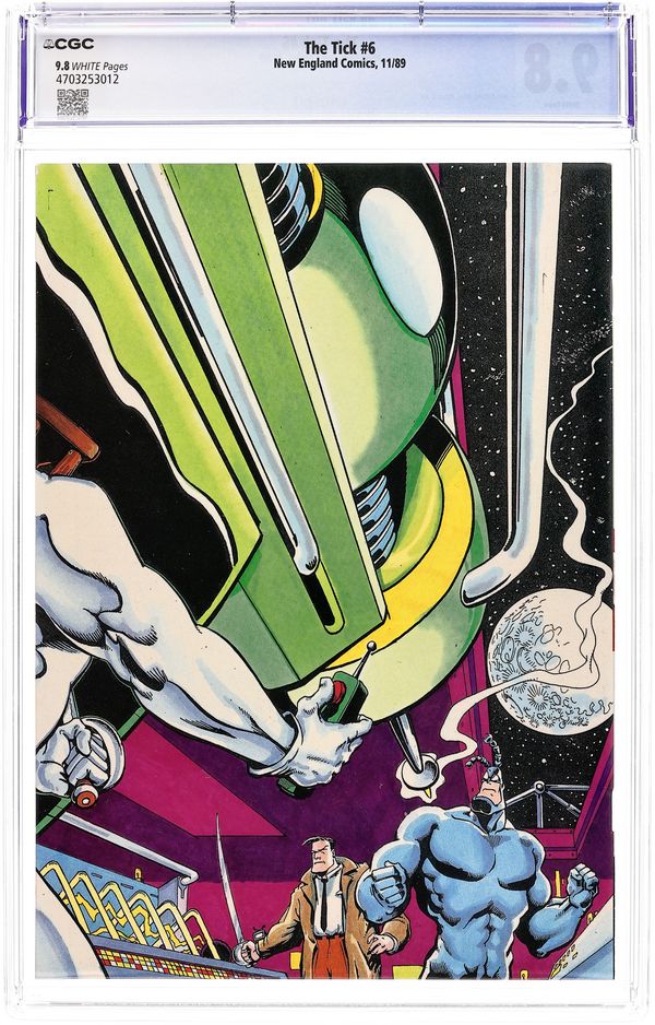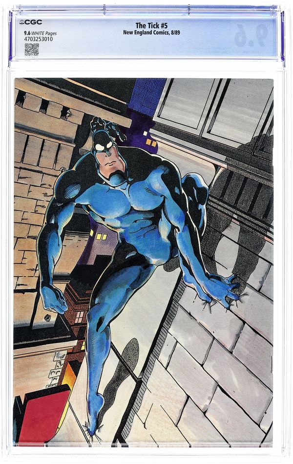 This is a 2nd printing as noted on the inside indicia. Written by Ben Edlund. Art and cover by Ben Edlund. The Tick arrives straight from the nuthouse and into The City where he decides to be a superhero. After having a tussle with ninjas and being run over by a train, he is no closer to realizing his lofty goals. One page art lesson on how to draw The Tick by Ben Edlund. 7.5-in. x 10.5 in. 40 pgs., B&W. $1.95. Cover price $2.75.
