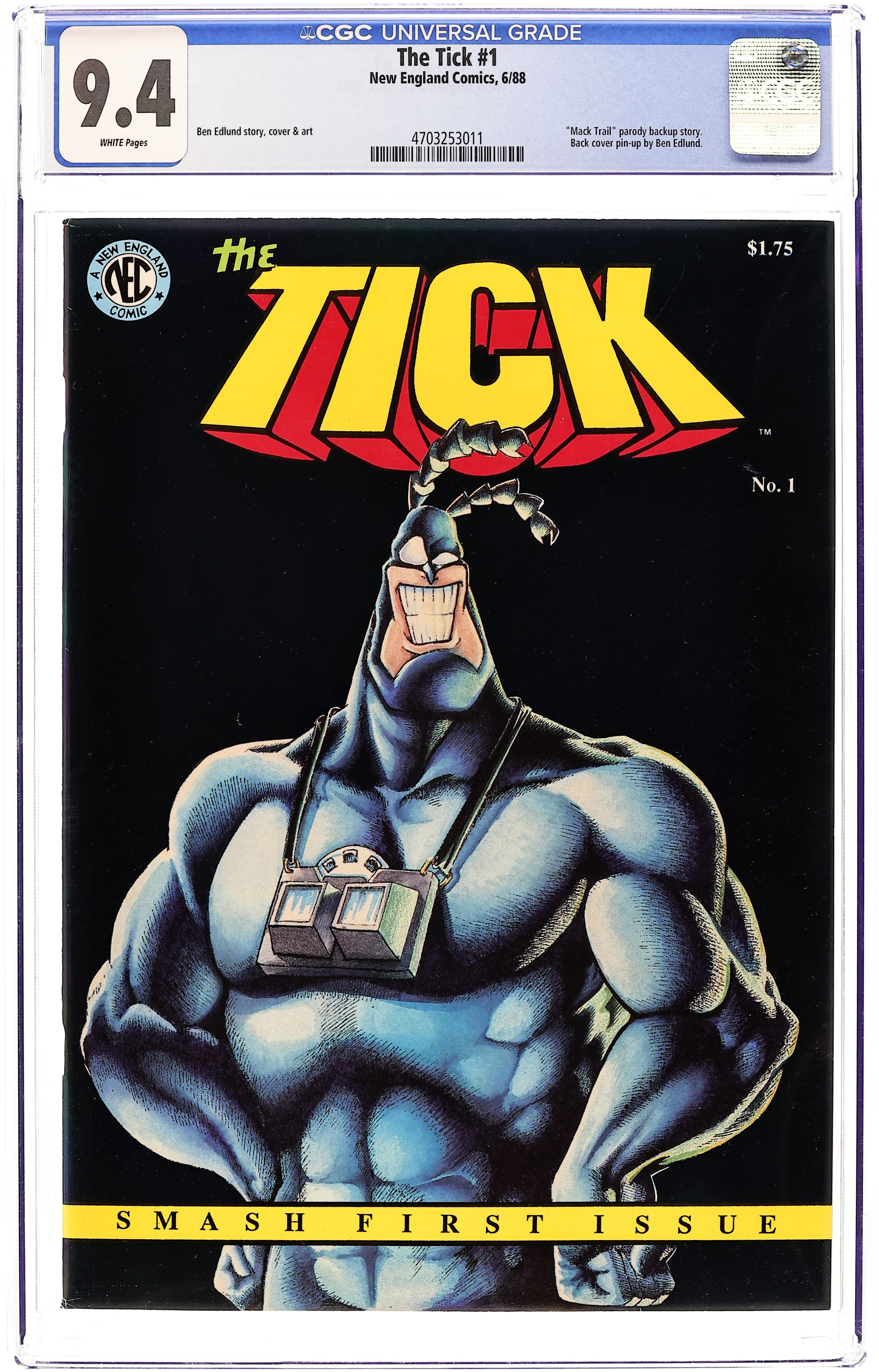 (2nd Edition) inside cover. This is a first printing of Tick #1, but Tick #1 reprints the serially numbered Tick Special Edition (1st appearance) w/minor changes. NOTE: This is a 1st Printing. 1st printings do not have a 2nd or later printing notice in indicia. Written by Ben Edlund. Art and cover by Ben Edlund. The Tick arrives straight from the nuthouse and into The City where he decides to be a superhero; After having a tussle with ninjas and being run over by a train, he is no closer to realizing his lofty goals. One page art lesson on how to draw The Tick by Ben Edlund. 36 pgs., B&W. $1.75. Cover price $1.75.