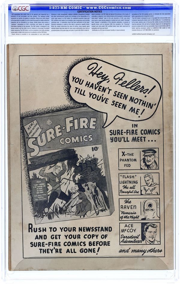 Ends Apr 13 8:31 PM CST Bid History 6 bids Current Bid $140 Your Secret Max Bid If you'd like to bid, please log in or register. Jim Mooney cover. In order of appearance: "'Flash' Lightning" art by Jim Mooney, reprinted in Men of Mystery Comics (1996- AC Comics) #29; "The Raven"; "Doctor Nemesis, Rx"; "Congo Jack" art by Mark Schneider; "Marvo the Magician and Tito"; "Hap Hazard"; and "Whiz Wilson". "The Big Reward" in-house comic advertisement for Super Mystery Comics Vol. 2 (1941), art by Jack Alderman. "I Knew Buffalo Bill" text story biography of Buffalo Bill Cody by 'Old-Timer'. 68 pages. Full color. Cover price $0.10.