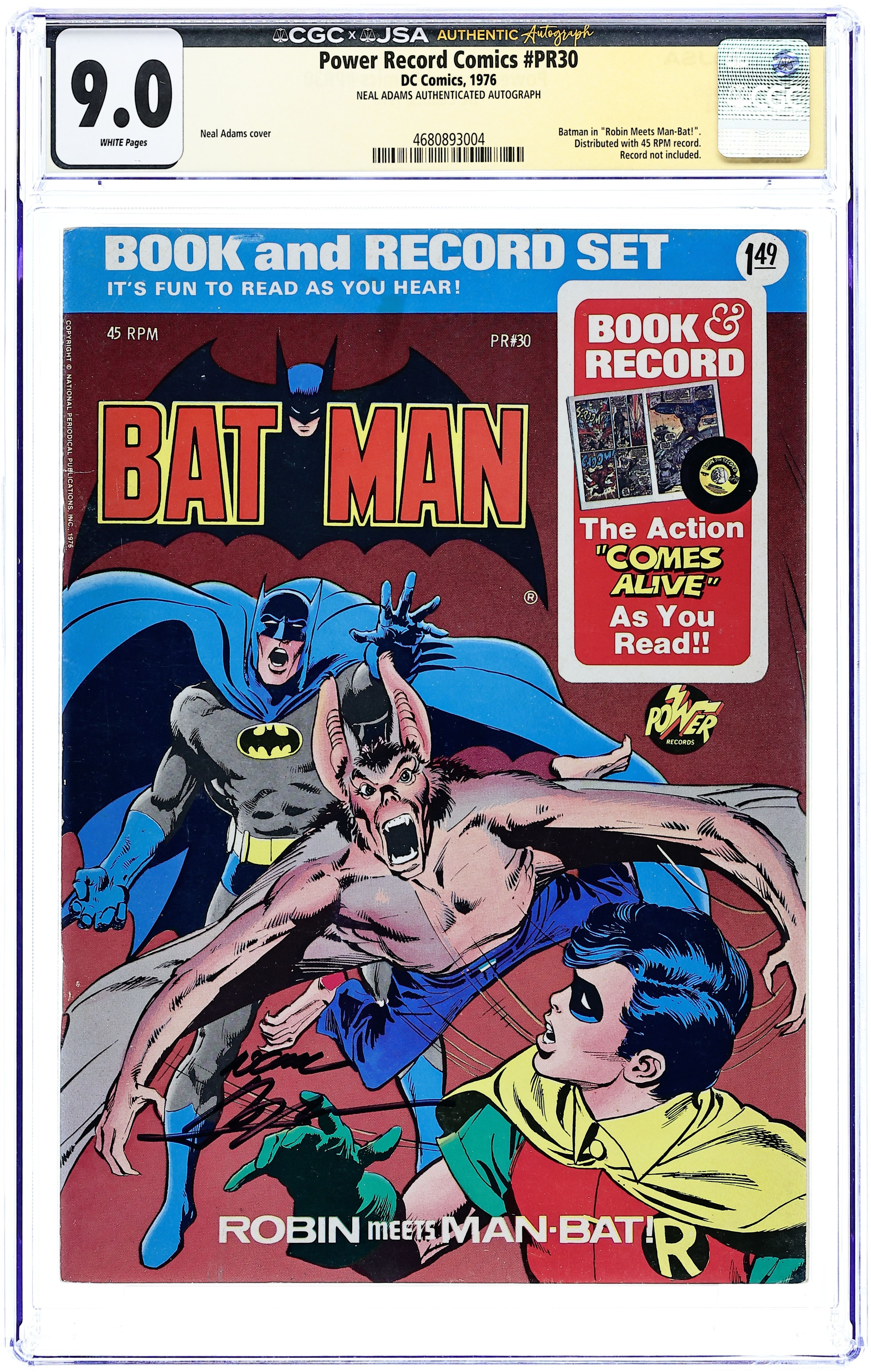 1st Power Records Edition. COMIC ONLY, NO RECORD, otherwise complete as graded. REISSUE! Batman Vol. 2, "Robin Meets Man-Bat!" Pencils by Neal Adams, inks by Dick Giordano. Adams front and back cover. 20-page full color comic with 45 RPM record. 7-1/8 x 10 inches with cardstock cover and white non-gloss interior paper stock. NOTE: Any copy listed here, regardless of grade assigned, comes WITHOUT the 45 RPM record (if the record is included, it may not be playable). Cover price $1.49.