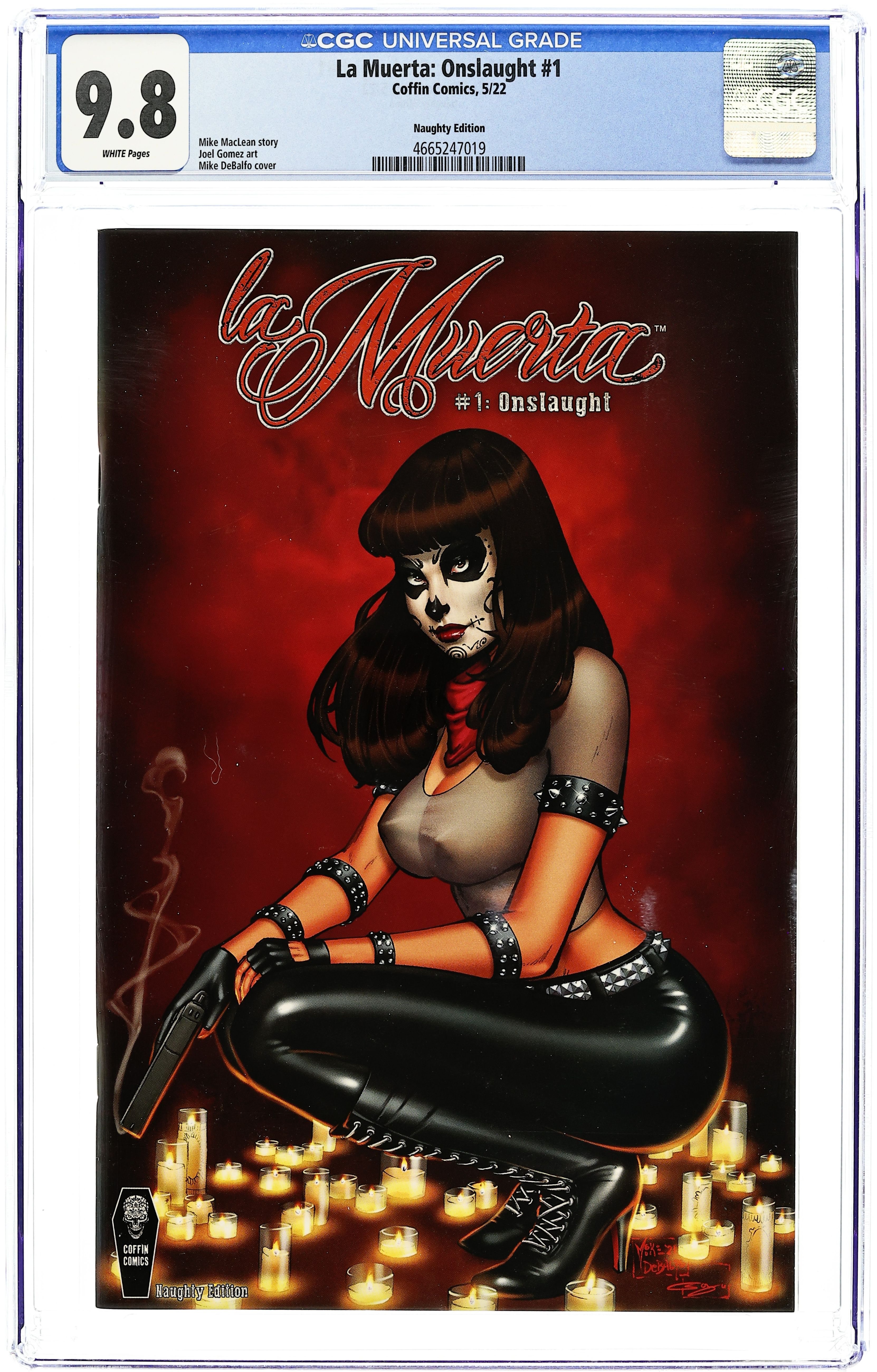 Naughty Edition. Written by Mike MacLean. Art by Joel Gomez. Cover by Mike Debalfo. Guest appearance by Lady Death! 'Deathocalypse', an official year long company wide event unfolds here! Maria Diaz stalks the streets as the relentless vigilante La Muerta, seeking vengeance against the criminal underworld. For a time, all was peaceful and quiet in her life - until tonight! 48 pages, full color. Cover price $25.00.