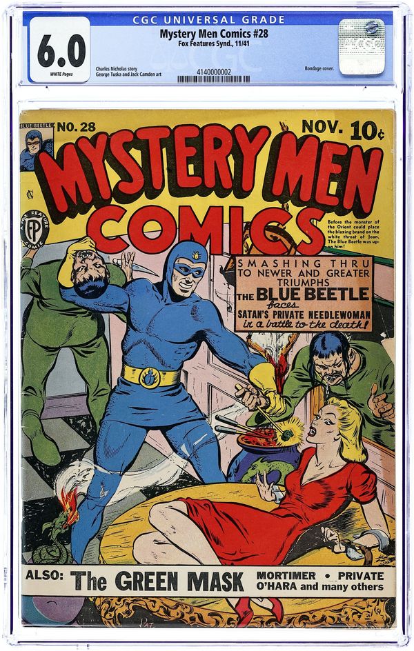 Cover by Lou Fine. Stories by Dick Briefer, Fred Schwab, and Will Eisner. Art by Walter Frame, Dick Briefer, Fred Schwab, Munson Paddock, George Tuska, Klaus Nordling, Arthur Peddy, Charles Nicholas, Art Franklin, Bob Powell, and John Lindermayer. An anthology of Golden Age adventure comics from Fox Feature, including the original Blue Beetle. A mysterious superhuman causes Rex Dexter to age rapidly and menaces him with bizarre monsters, in another one-of-a-kind story by Dick Briefer; Early adventures of The Blue Beetle and The Green Mask likely written by Will Eisner; Zanzibar, who looks like Mandrake the Magician in a blue fez, battles the Walrus Men at the South Pole. The Will of John D. Lovingston; The Robot Solar System; Come! Come!; River Lily and the Purr of Death; The World Race; Big-Shot Krard's Dope Ring; The Case of Oil; Mr. Death; Ki-Mung, Bloodthirsty Buccaneer; A Trap for the Blue Beetle; Inspector Bancroft of Scotland Yard Smashes a Spy Ring; Ki-Mung, Bloodthirsty Buccaneer; Tiger Hunt; Super Sleuths; Marooned at the South Pole. 64 pages, Full Color. Cover price $0.10.