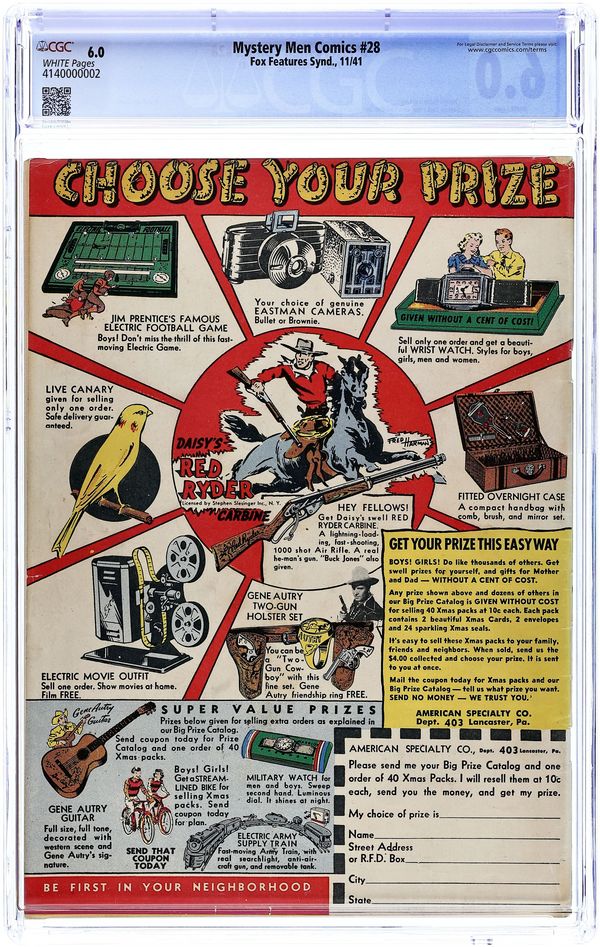 Cover art by Joe Simon. "Bomb Kills Hundreds in Midtown," art by Charles Nicholas; The Blue Beetle vs. The Sylvanian Consul Secretary; Beetle defeats 20 mobsters in one fistfight. Untitled story, art by George Tuska; Wing Turner battles Nazis. Untitled story, script and art by Dick Briefer; Rex Dexter vs. The Hunter. Untitled story, art by Walter Frehm; The Green Mask deals with a Federal Reserve robbery. "Demons of Doom" starring Chen Chang, art by Munson Paddock (as Cecilia Munson). "Twentieth Century Death Ray" text story by B. A. Martin. Untitled story, script and art by Klaus Nordling (as F. Klaus); Lt. Drake is assigned the task of capturing the men responsible for smuggling orientals into the United States. "The Strange Case of the Terror Castle Grave Robberies," art by Jim Mooney; The Doc sends some of his hoodlums into a cemetery looking for a disease-free body into which he plans to transplant a brain, thus allowing him to have the power of God to create life. Untitled Hemlock Shomes by Fred Schwab. Untitled D-13 story, script and art by Bob Powell; An attack in the South Atlantic; vs. Nazis. Untitled story, art by George Tuska; Zanzibar vs. The Zombie Master. 68 pgs., full color. Cover price $0.10.