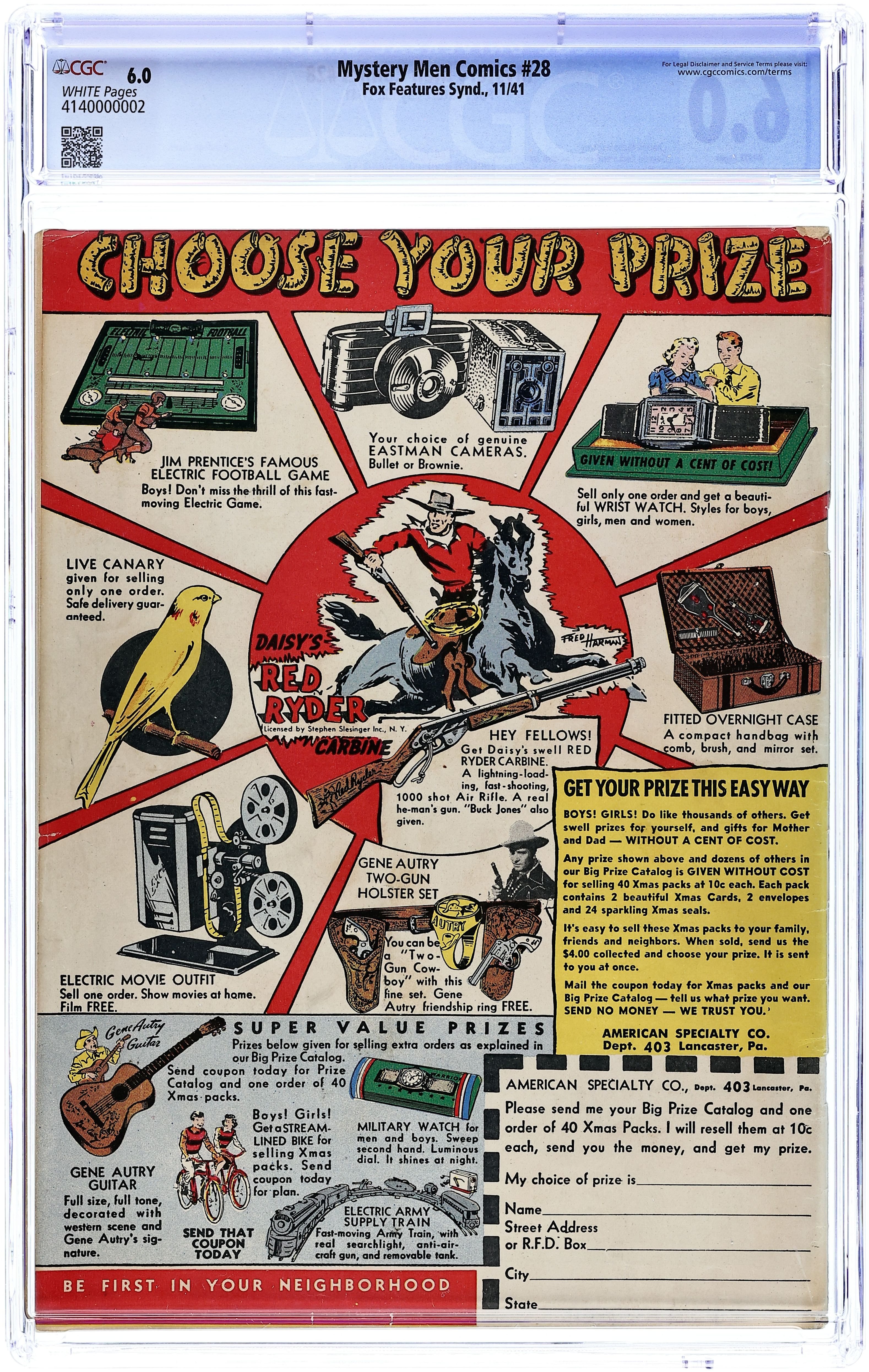 Cover art by Lou Fine. Untitled story, art by Walter Frehm; The Green Mask, alarmed at the Tong wars erupting in Chinatown, seemingly joins forces with the nefarious San Sin in order to find a way to rescue Fong Lee's daughter from his evil clutches. Untitled story, script and art by Dick Briefer; A mysterious plague threatens to destroy all life on Earth, and the only cure is radium: but the Earth doesn't have sufficient quantities in order to deal with the disease. Untitled story, art by Munson Paddock (as Cecilia Munson); River pirate Chang orders his thugs to capture Kendall and take him to the mysterious River Lily aboard the "Dragon Heart." "Famed Statue Missing," art by George Tuska; Zanzibar investigates the theft of the famed statue: the Venus de Milo. Untitled story, script and art by Fred Schwab; Hemlock and the good doctor visit Spookington Castle in order to try and collect a $10 reward for the return of the kidnapped Mrs. Spookington. "The Long Arm of Vengeance" text story by Will Eisner. Untitled story, art by Arthur Peddy; As the Waco Kid rides along, he spots a wanted poster: on himself, for bank robbery and murder! Untitled story, art by Charles Nicholas; A group of thugs rob an armored car of its $80,000 payload and capture the Beetle in the process; A group of thugs rob an armored car of its $80,000 payload and capture the Beetle in the process. Untitled D-13, Secret Agent story, script and art by Bob Powell. Untitled Captain Denny Scott of the Bengal Lancers story, art by John Lindermayer (as L. Mayer); Captain Scott and James enter the town of Gulam, unaware that a sinister figure named Kahn and his men are out to kidnap the boy. Untitled Lt. Drake of the Naval Intelligence story, script and art by Klaus Nordling (as F. Klaus). 68 pgs., full color. Cover price $0.10.