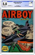Cover by Dan Barry. Stories and art by Arthur Peddy, Bernard Sachs, Frank Giacoia and Fred Kida. One of the more fanciful and influential of 1940s aviator heroes, Airboy fights evil with his radio-controlled plane "Birdie" and its plethora of experimental flying tech. Sometimes listed as Airboy Comics #49. No issue # on cover; Vol. 5, issue #2 in indicia. Airboy hears a raving man's tale of The Wild Horse of Calabra. A Central American prospector tries to kill his partner to claim their find for himself, but he hadn't reckoned on The Heap, or human greed. Flying Fool and his female rival Riot O'Hara race to claim a dangerous job in the wilds of northern China. Eye-catching cover by Flash Gordon's Dan Barry. Airboy: The Wild Horse of Calabra; The Heap; Model Builders with Airboy; Right On Time; Horsethief; Flying Fool; The Golden Altar of Panama. 52 pages, Full Color. Cover price $0.10.